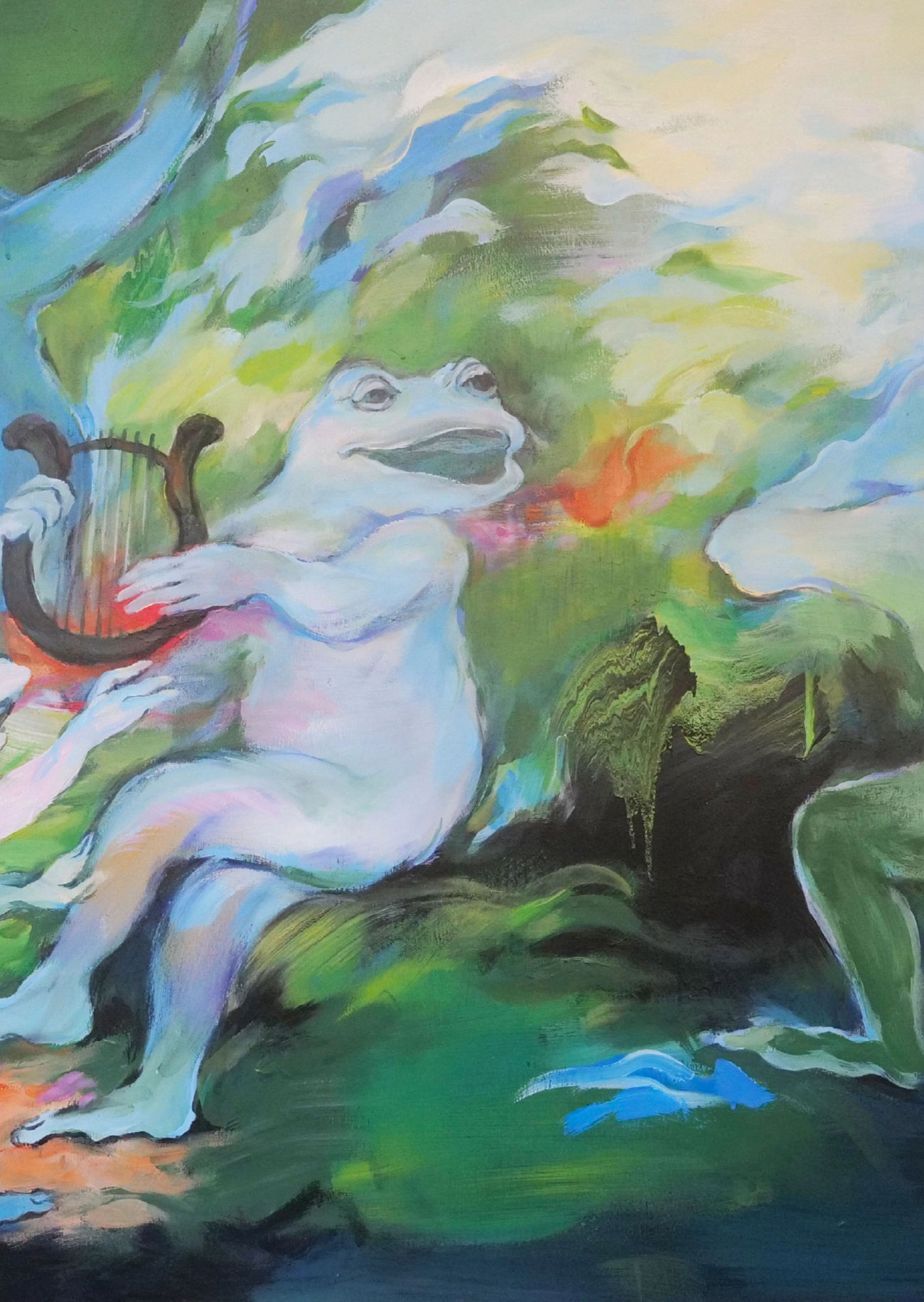 Elle s’empare de l’image d’Apollon et de ses pouvoirs divinatoires, et nous révèle un futur où les arts triomphent dans Fête (Apollon et les muses), à travers l’image de la grenouille, animal particulièrement vénéré au Japon, qui apporte chance, protection et prospérité.