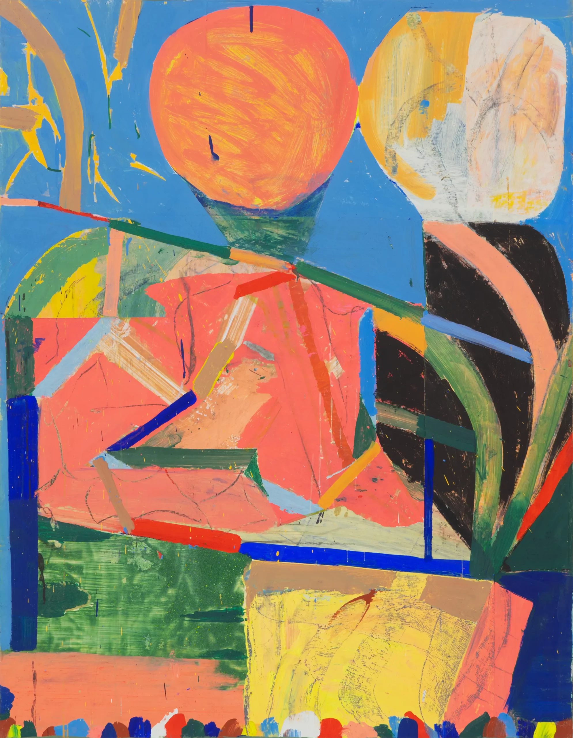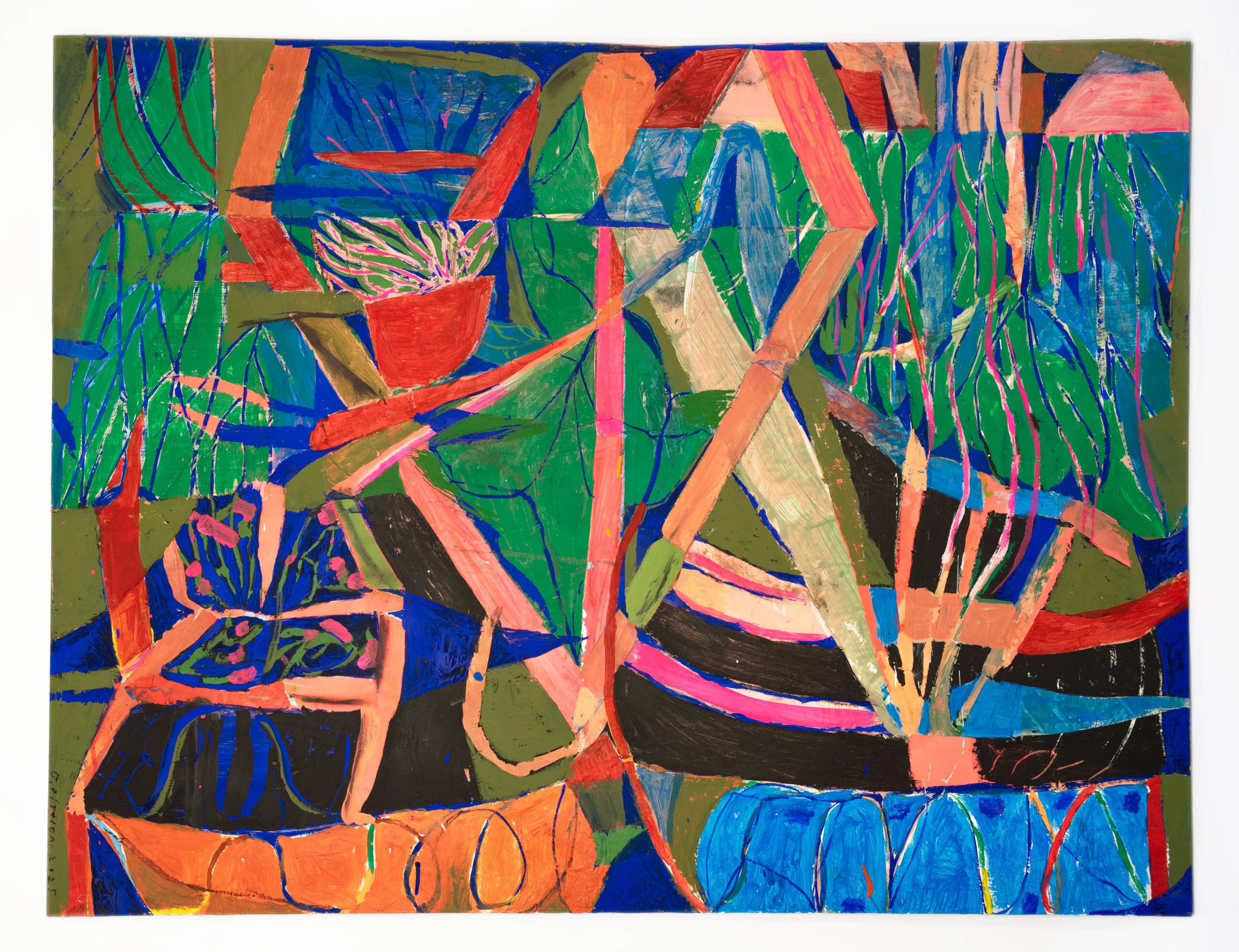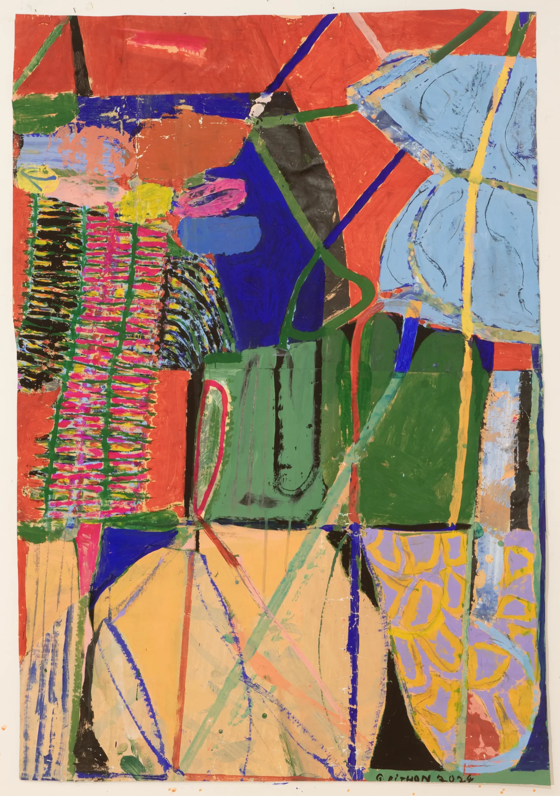Geoffroy Pithon est graphiste et peintre, deux pratiques à priori contraires, tant de contraintes pesant sur la première, et tant de liberté caractérisant la seconde. Pourtant, son art infuse son métier en permanence, et inversement : cette porosité traduit l’envie d’élaborer un langage propre où les couleurs, les mots, la gaucherie, les formes et les figures composent une chorale plus ou moins stable, dansante et énergique.