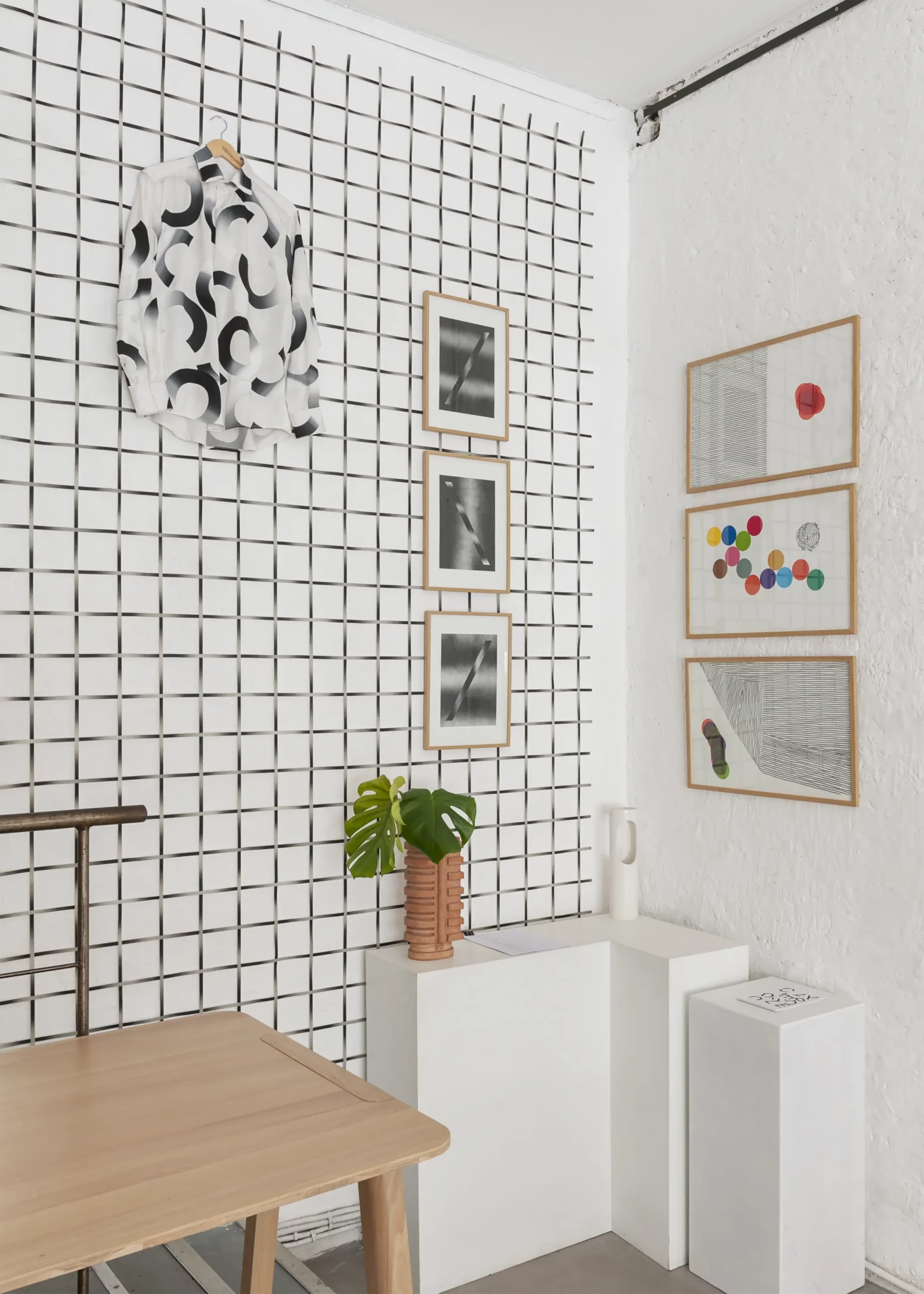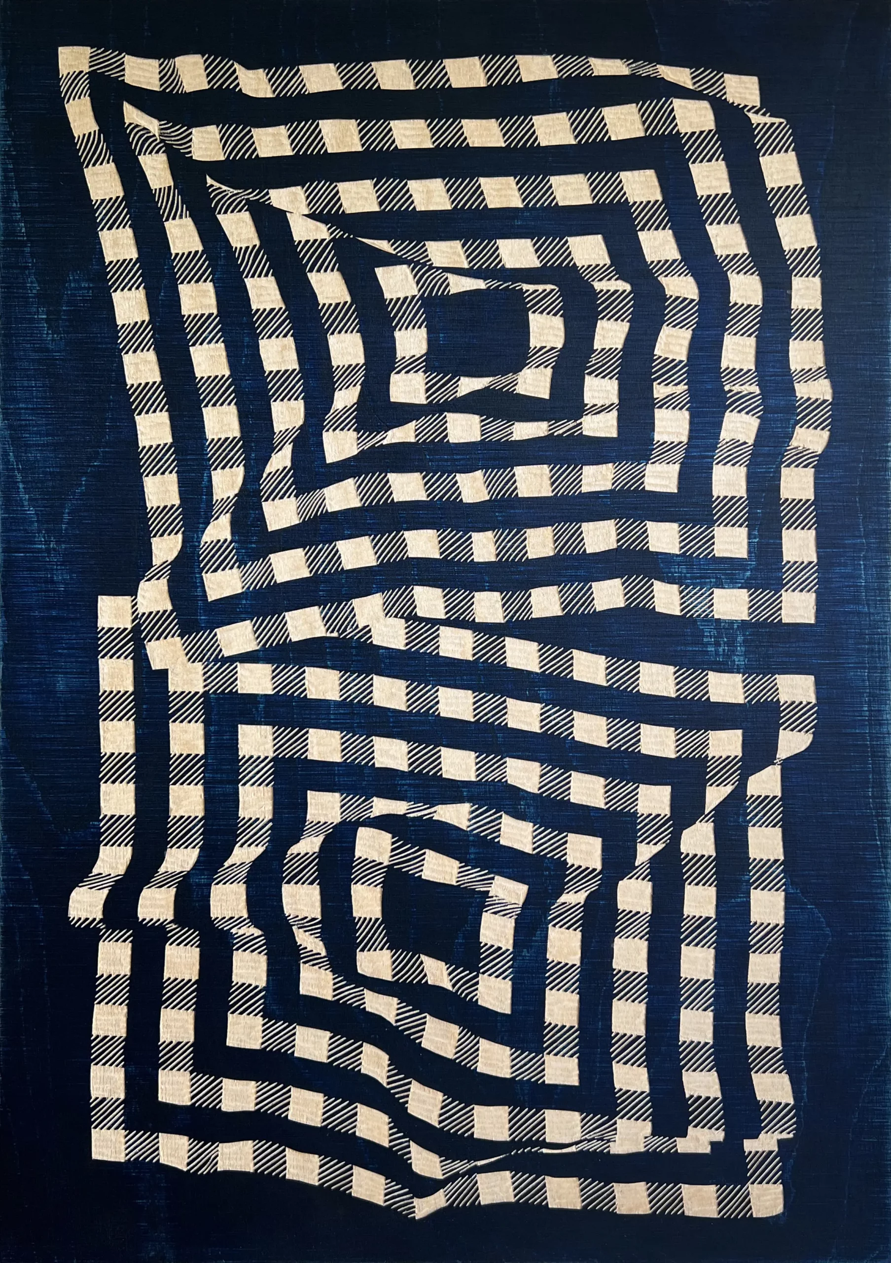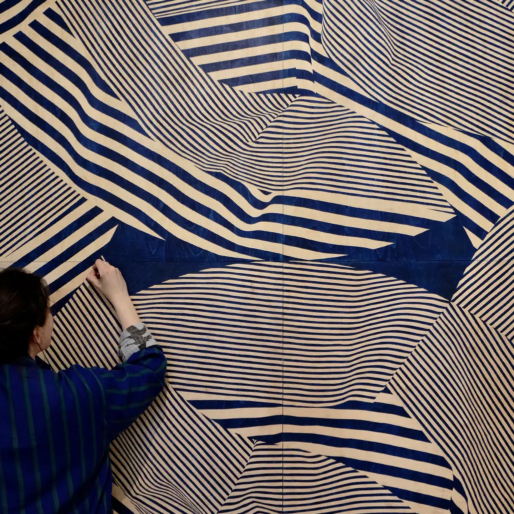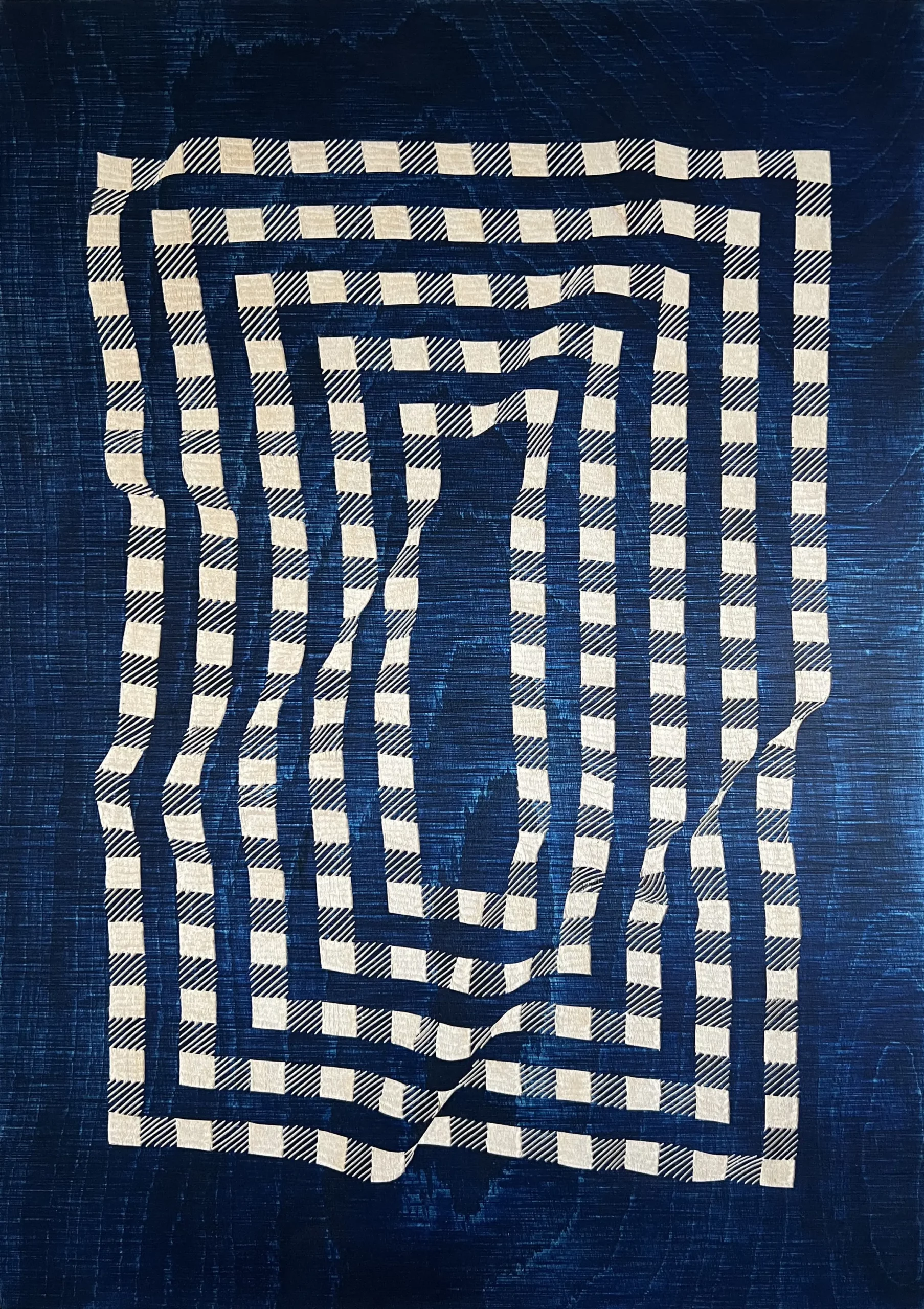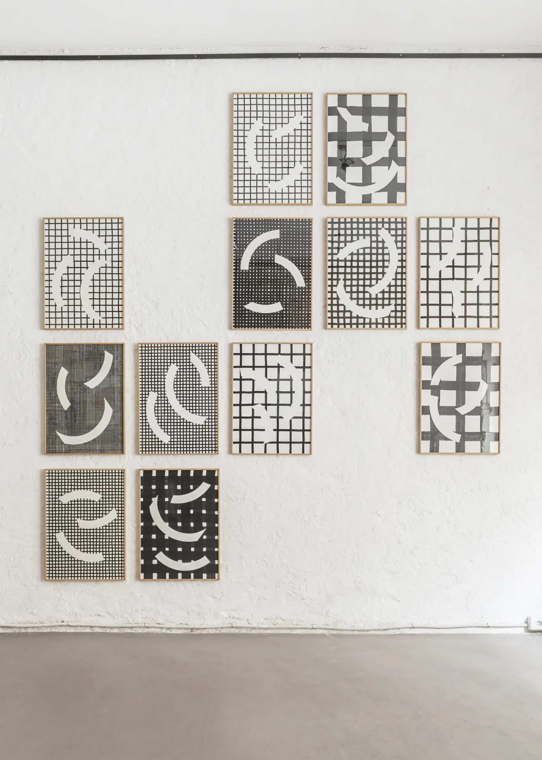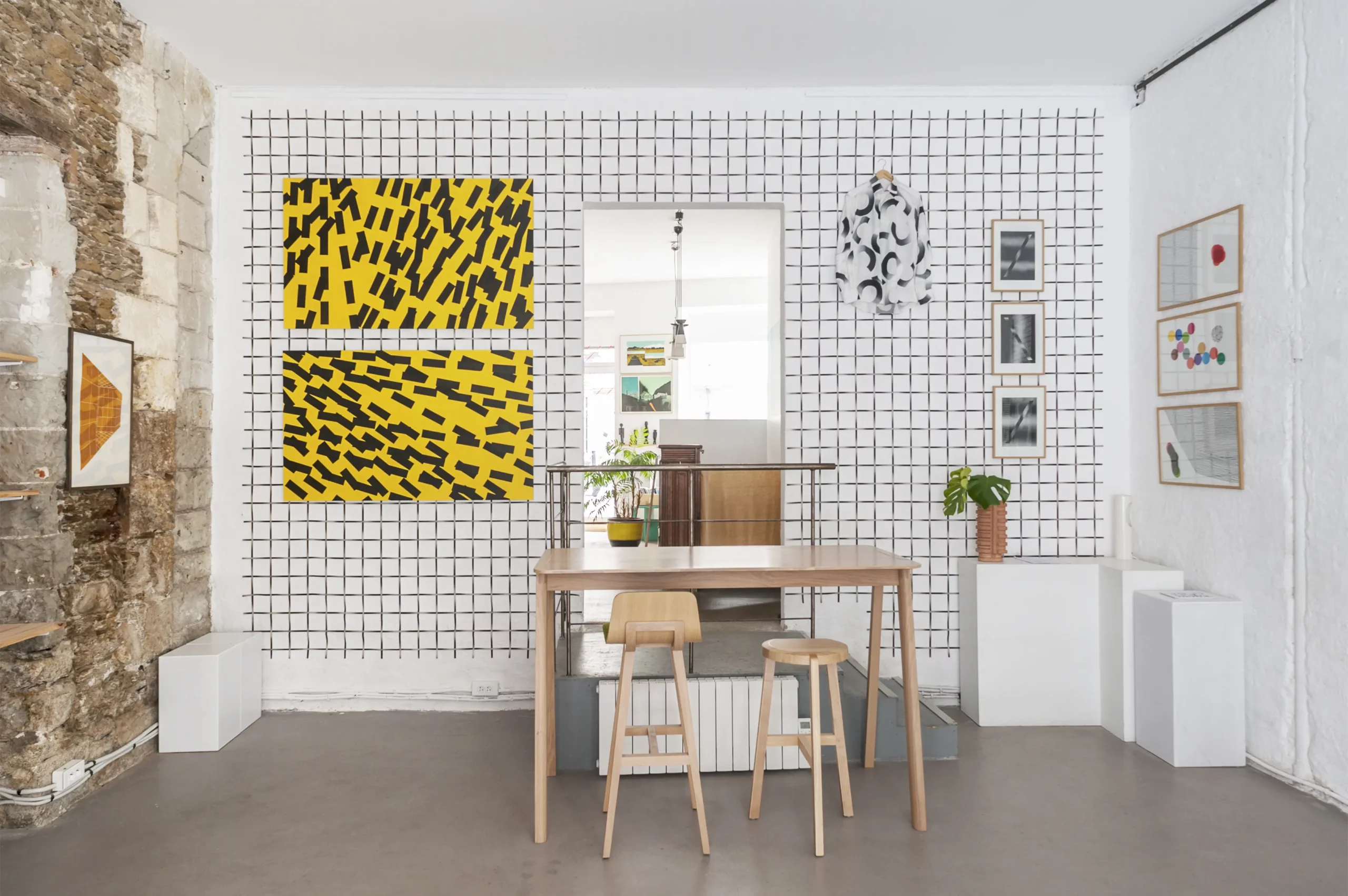Son travail s’articule essentiellement autour d’un fort intérêt pour la ligne et le motif. Elle joue des probabilités infinies qu’offrent les motifs. Rayures, quadrillages et géométrie, sont autant d’outils qui permettent à l’artiste de parler d’espace tout en élaborant un vocabulaire de formes.