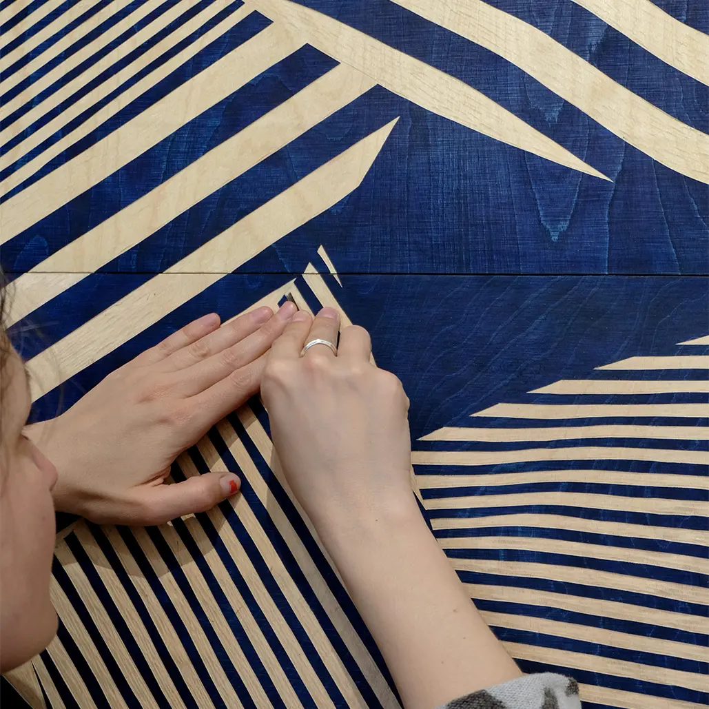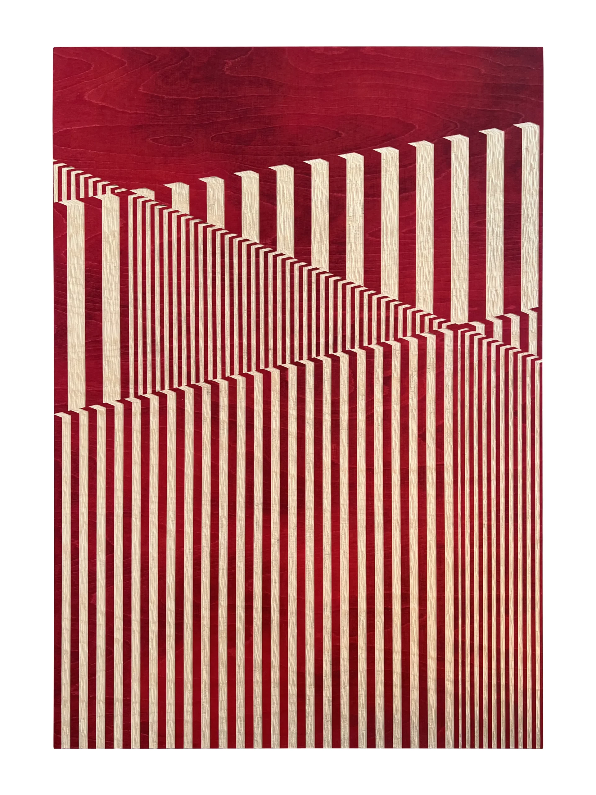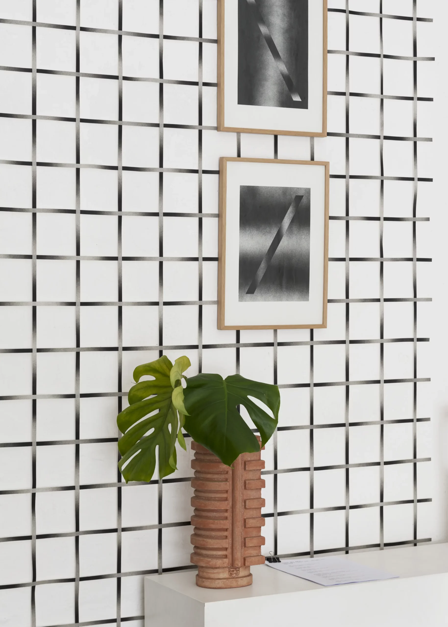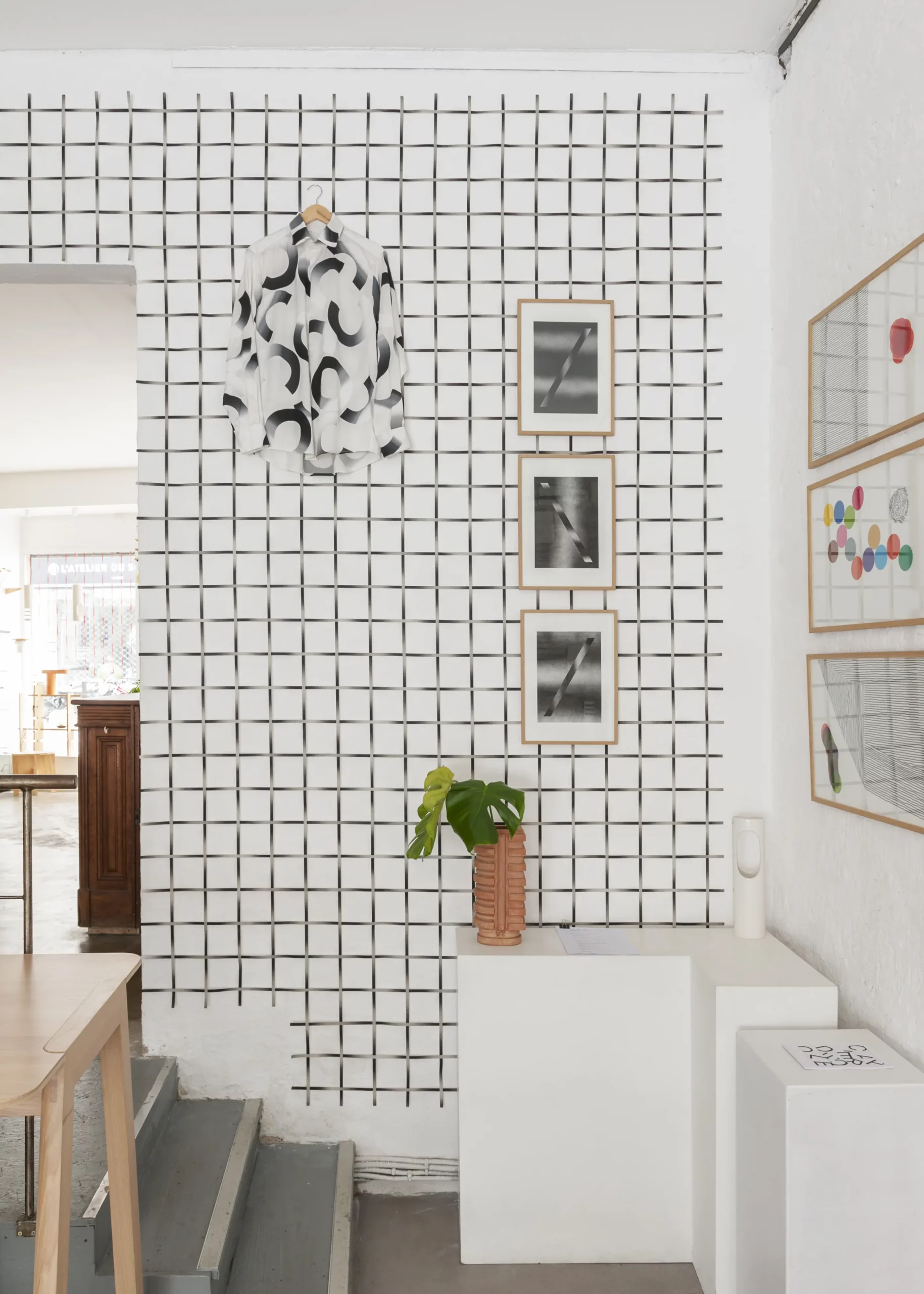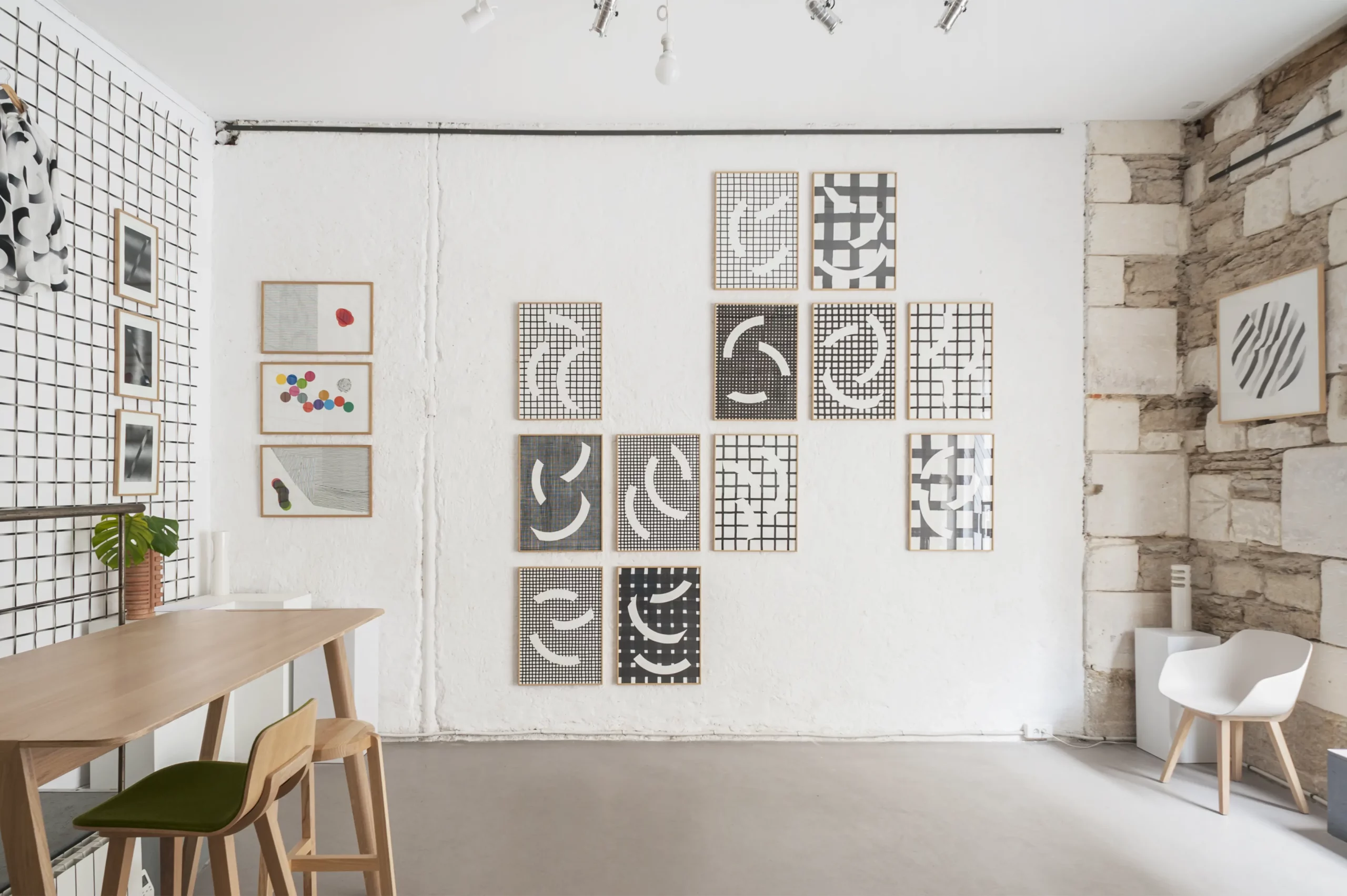 Son travail s’articule essentiellement autour d’un fort intérêt pour la ligne et le motif. Elle joue des probabilités infinies qu’offrent les motifs. Rayures, quadrillages et géométrie, sont autant d’outils qui permettent à l’artiste de parler d’espace tout en élaborant un vocabulaire de formes.