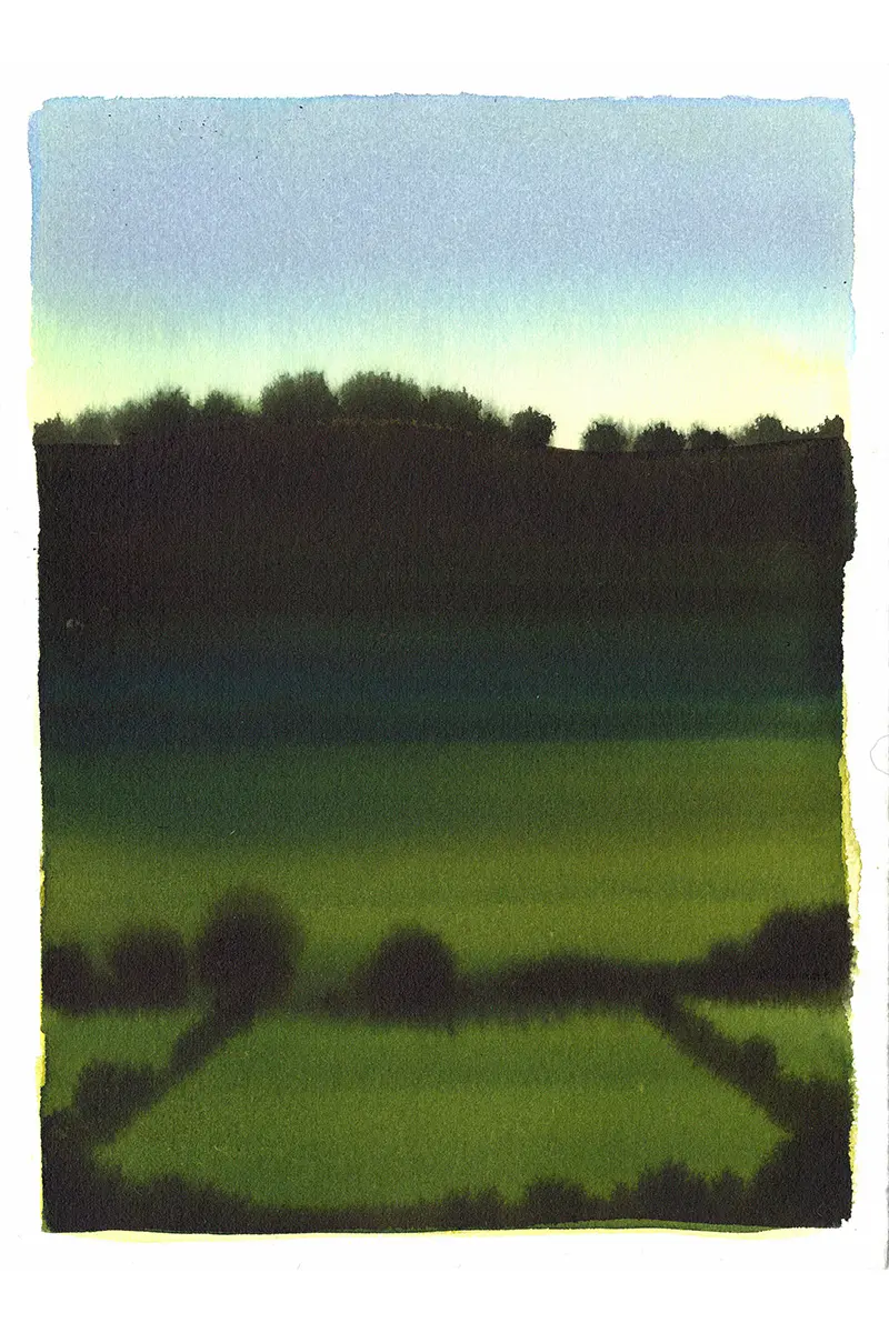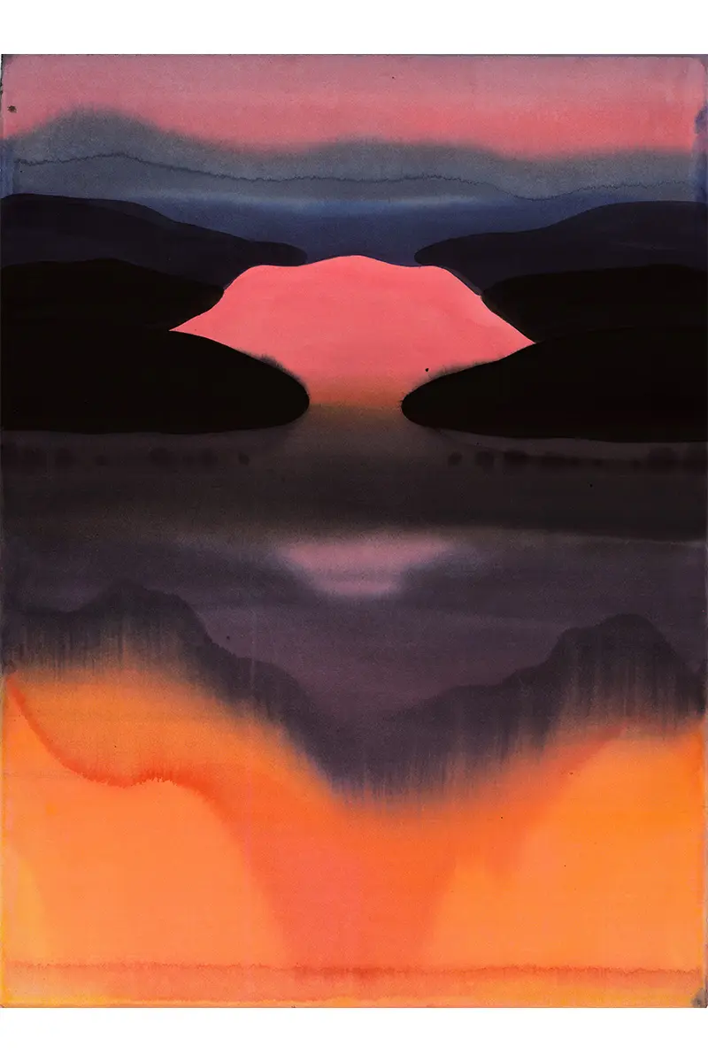Dans les paysages de Magali Cazo, les encres se diffusent dans le papier sans limites, sans frontières. Ici tout est contraste et reflets, la masse de la terre et la légèreté de l’air, et nous sommes de passage comme le soleil qui se lève puis se couche, avant de recommencer.