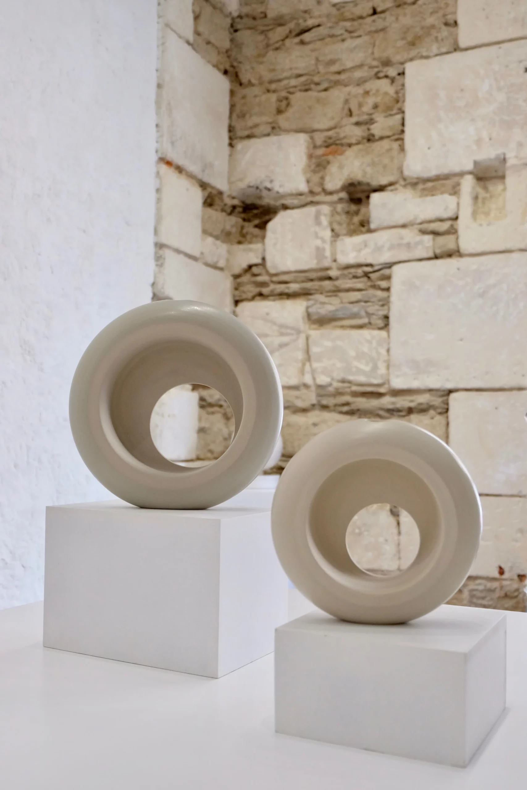 Dans une quête de recherche formelle, l’artiste joue avec les cercles concentriques et excentriques, avec le visible et l’invisible, les vides et les pleins, la lumière et l’ombre. Hélène révèle aussi des pièces rétro-futuristes, aux allures de soucoupe volante en lévitation !