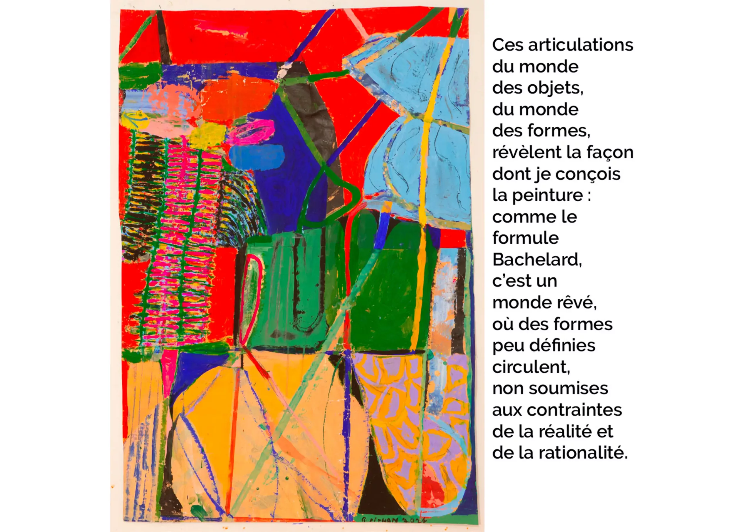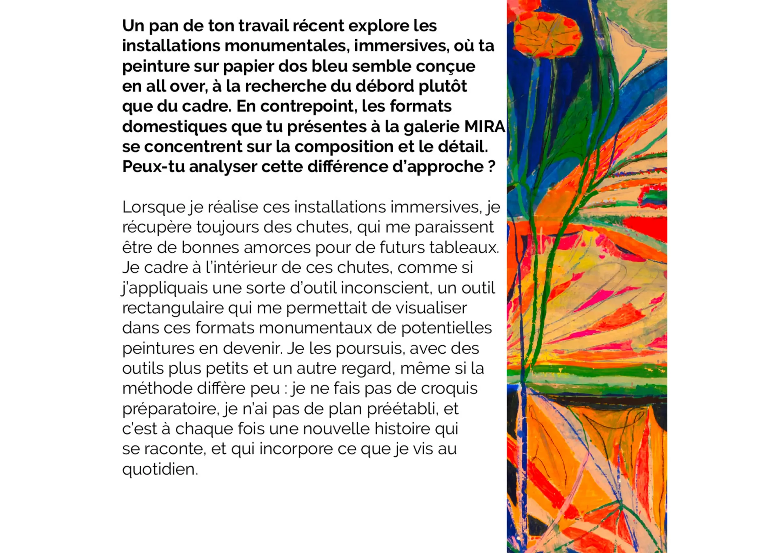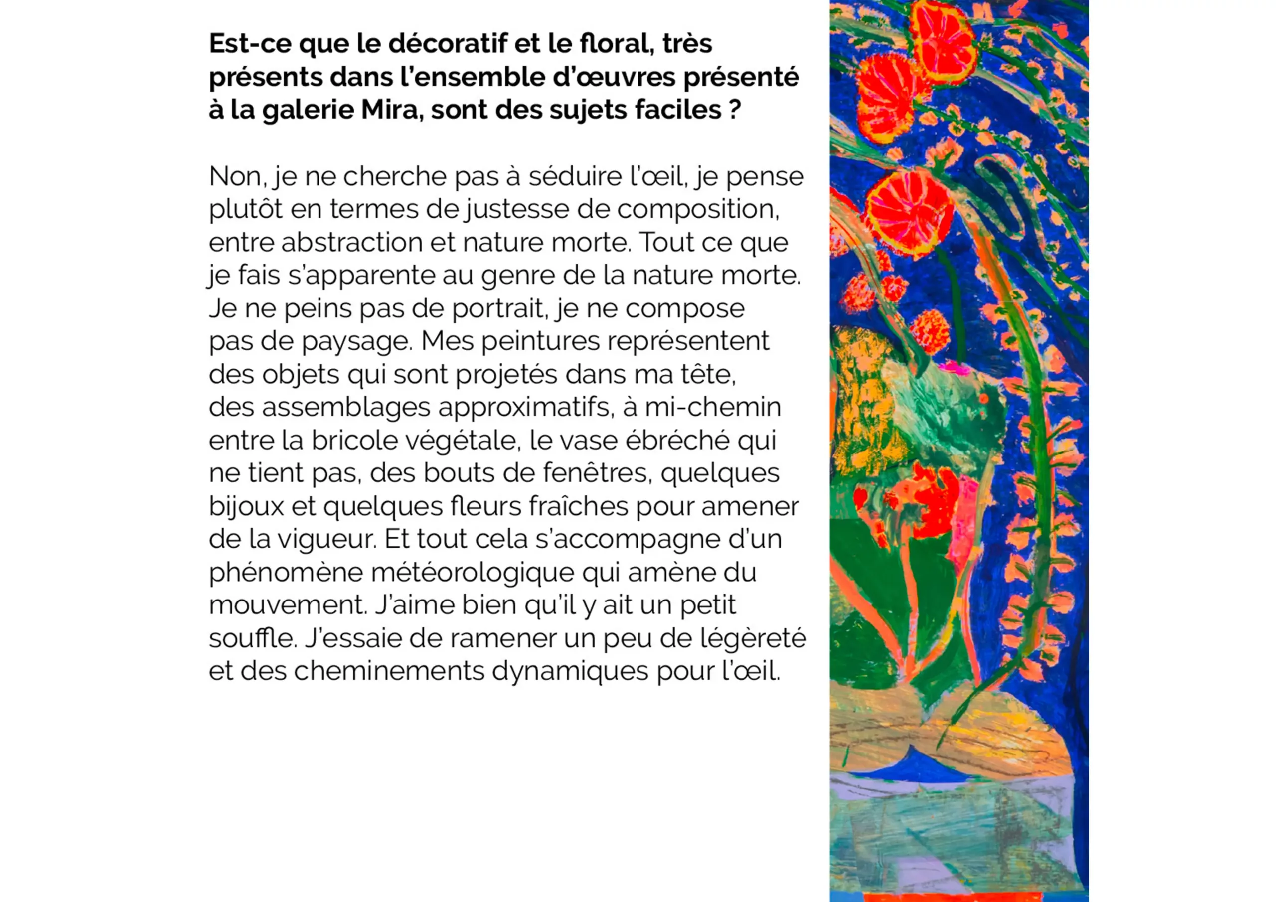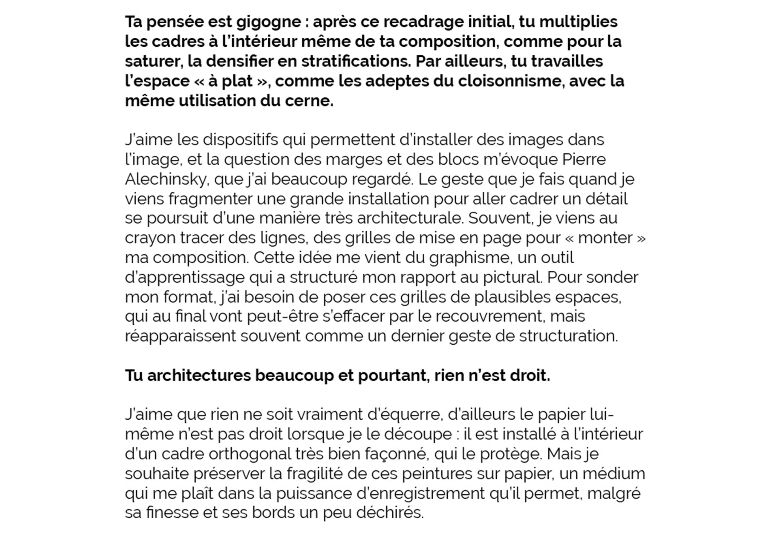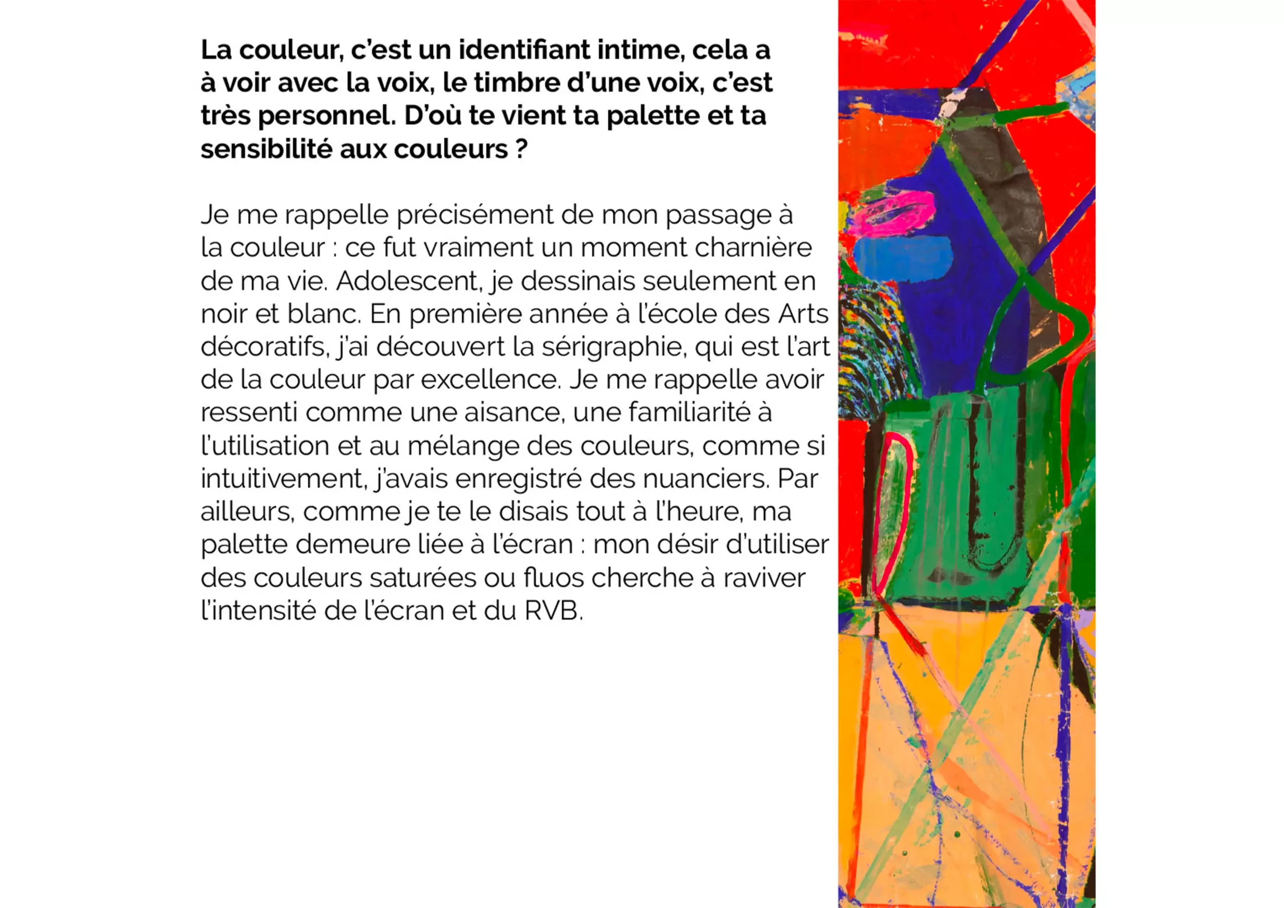 de contraintes pesant sur la première, et tant de liberté caractérisant la seconde. Pourtant, son art infuse son métier en permanence, et inversement: cette porosité traduit l’envie d’élaborer un langage propre où les couleurs, les mots, la gaucherie, les formes et les figures composent une chorale plus ou moins stable, dansante et énergique.