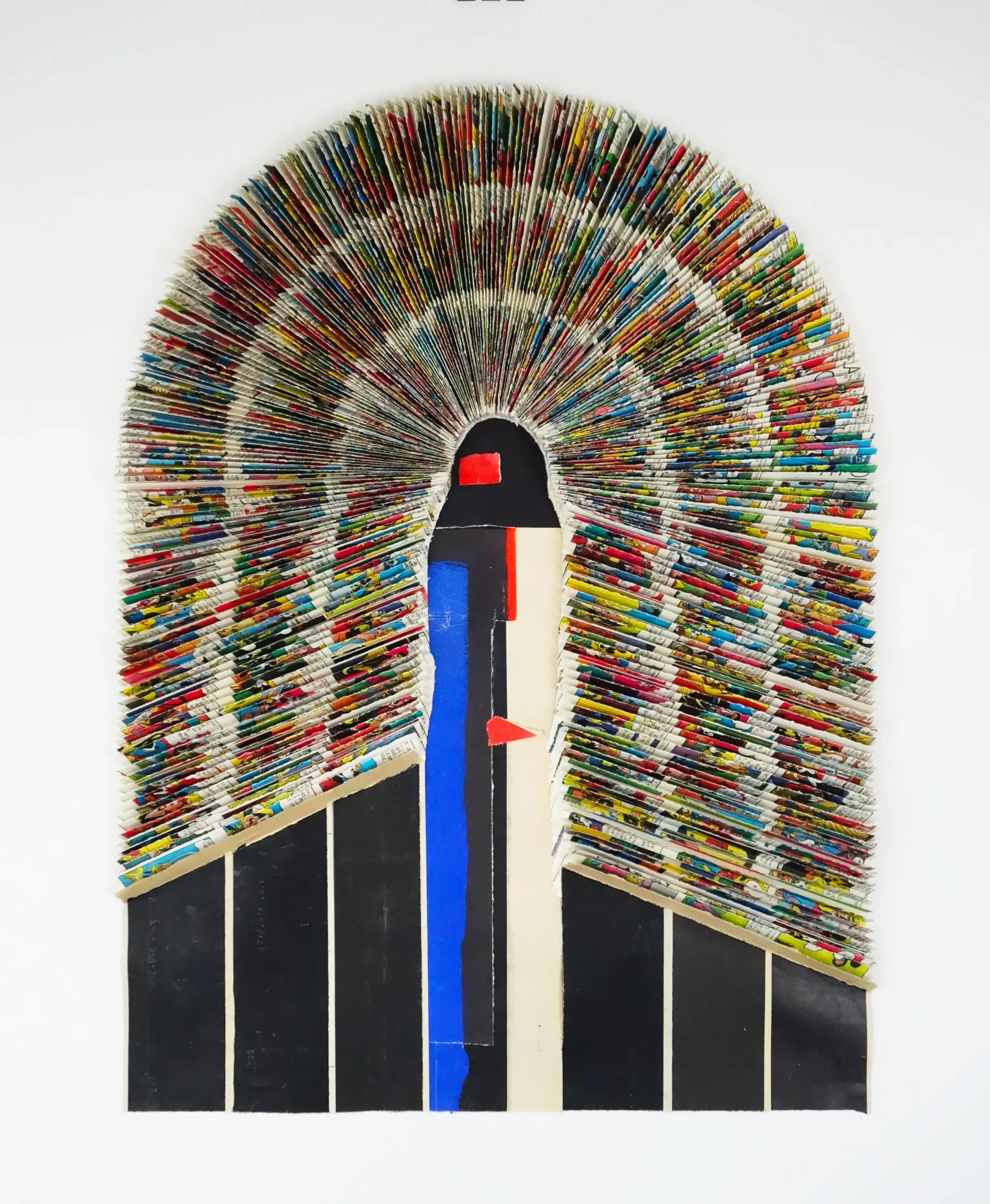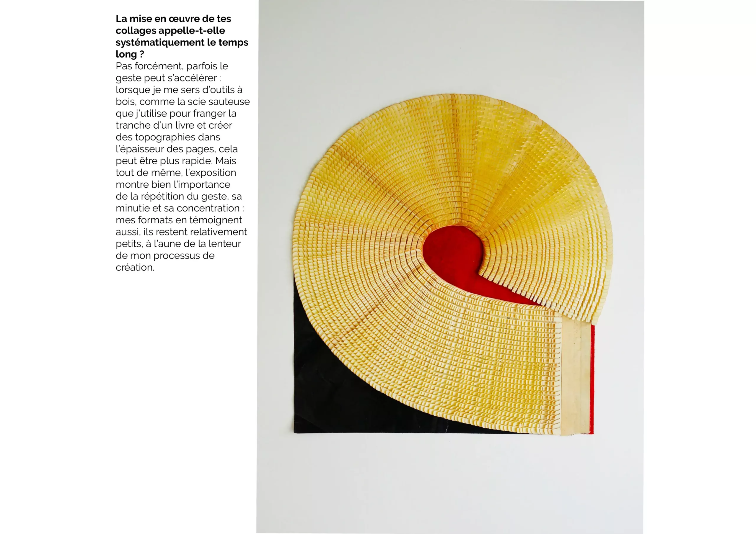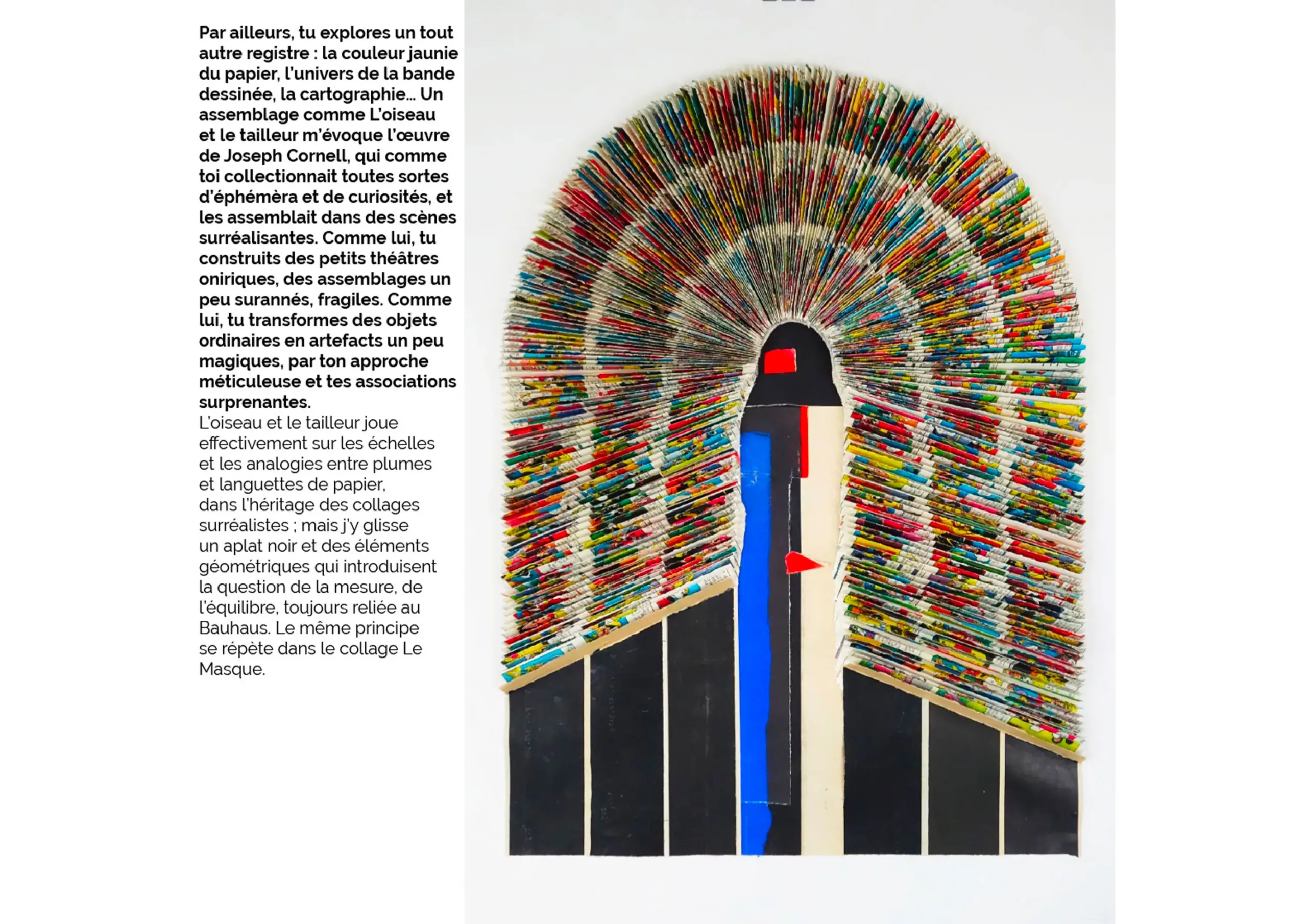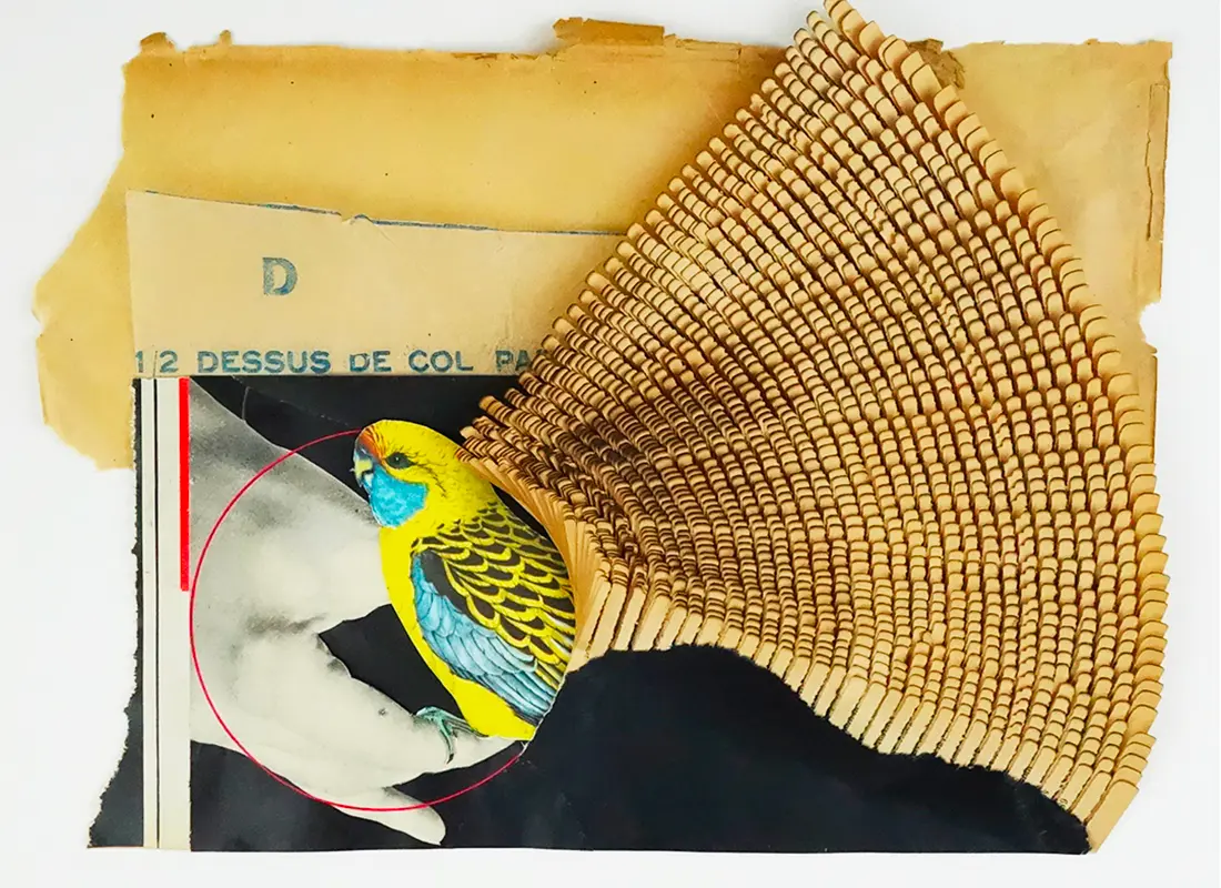 Luc LEBLANC travaille à partir d’objets trouvés. Il les rencontre, se les réapproprie, et finit par leur offrir une seconde vie. Ces récupérations ne laissent rien au hasard. À l’instar d’un peintre qui choisit la couleur qu’il apposera en premier sur sa toile vierge, Luc les sélectionne avec minutie puis les superpose. Sous la lame du scalpel, par la rigueur de l’aiguille ou l’aléa de la déchirure, la métamorphose de ces papiers est la raison même de son travail. Par la technique du collage, c’est une œuvre nouvelle et originale qui prend forme et se nourrit d’éléments préexistants. De creux et d’enchevêtrements, les collages de Luc Leblanc font renaître de leurs cendres ces papiers jaunis – témoignage d’une époque révolue – qui ne demandent qu’à raconter une nouvelle histoire. De la recherche graphique à la narration, de l’intertextuel à ce que les images tronquées ne révéleront jamais d’elles-mêmes, il n’y a pas de parti pris ici, juste un don de soi et une vision des choses qui ne sauraient être exprimés autrement. Pour sa troisième exposition à la galerie MIRA, Luc présente une nouvelle série de collages et deux créations réalisées à quatre mains avec Geoffroy Pithon son complice et ami artiste.