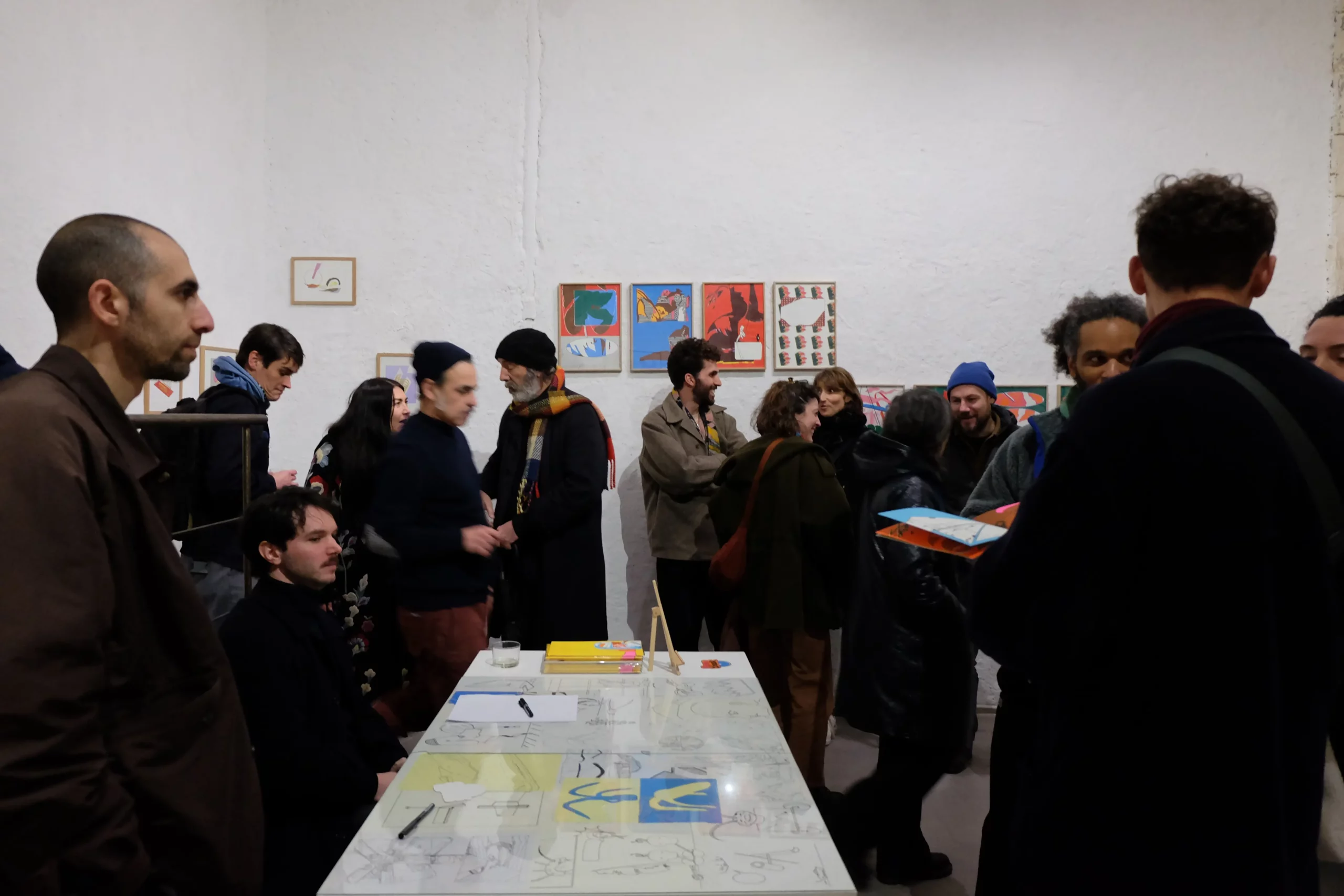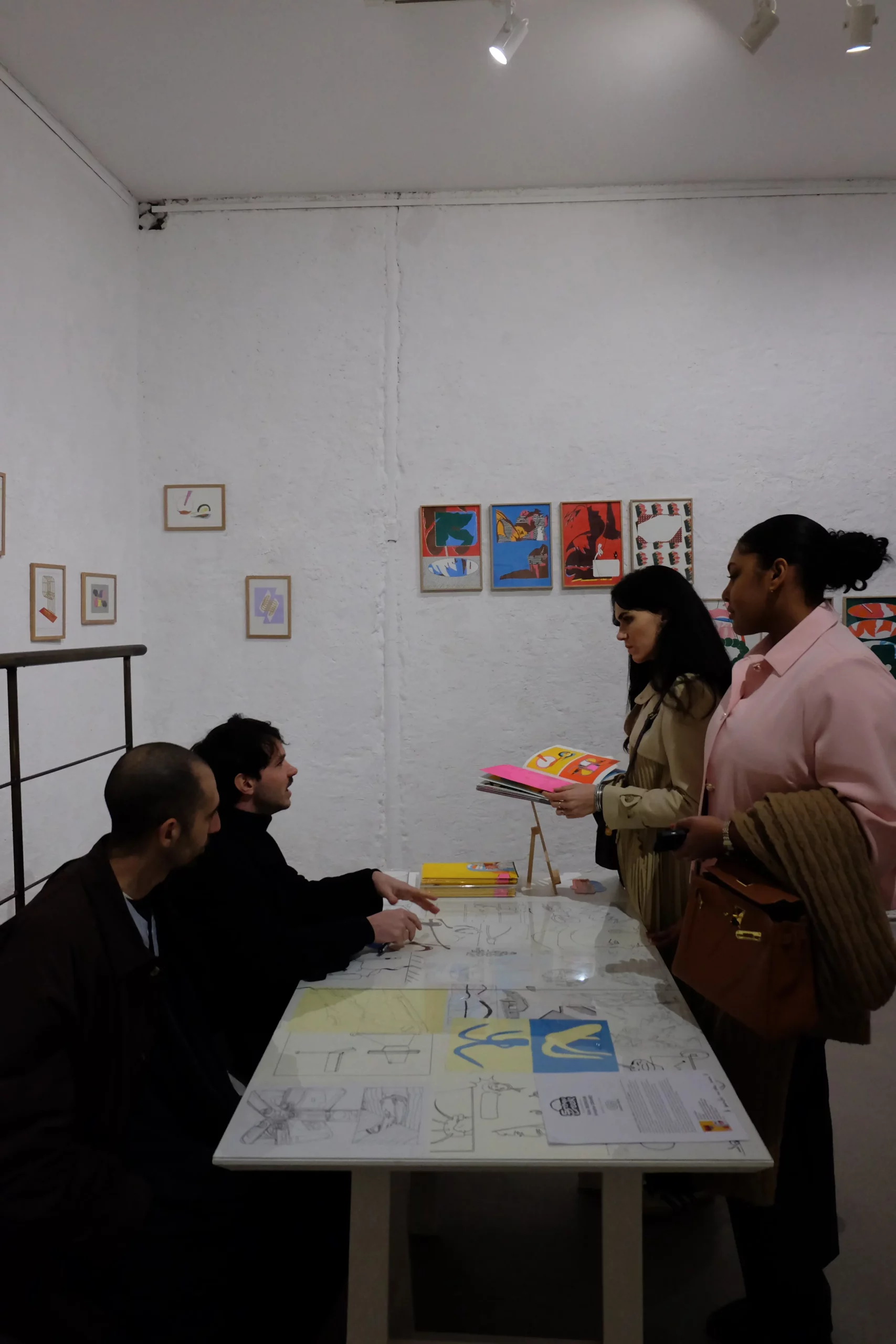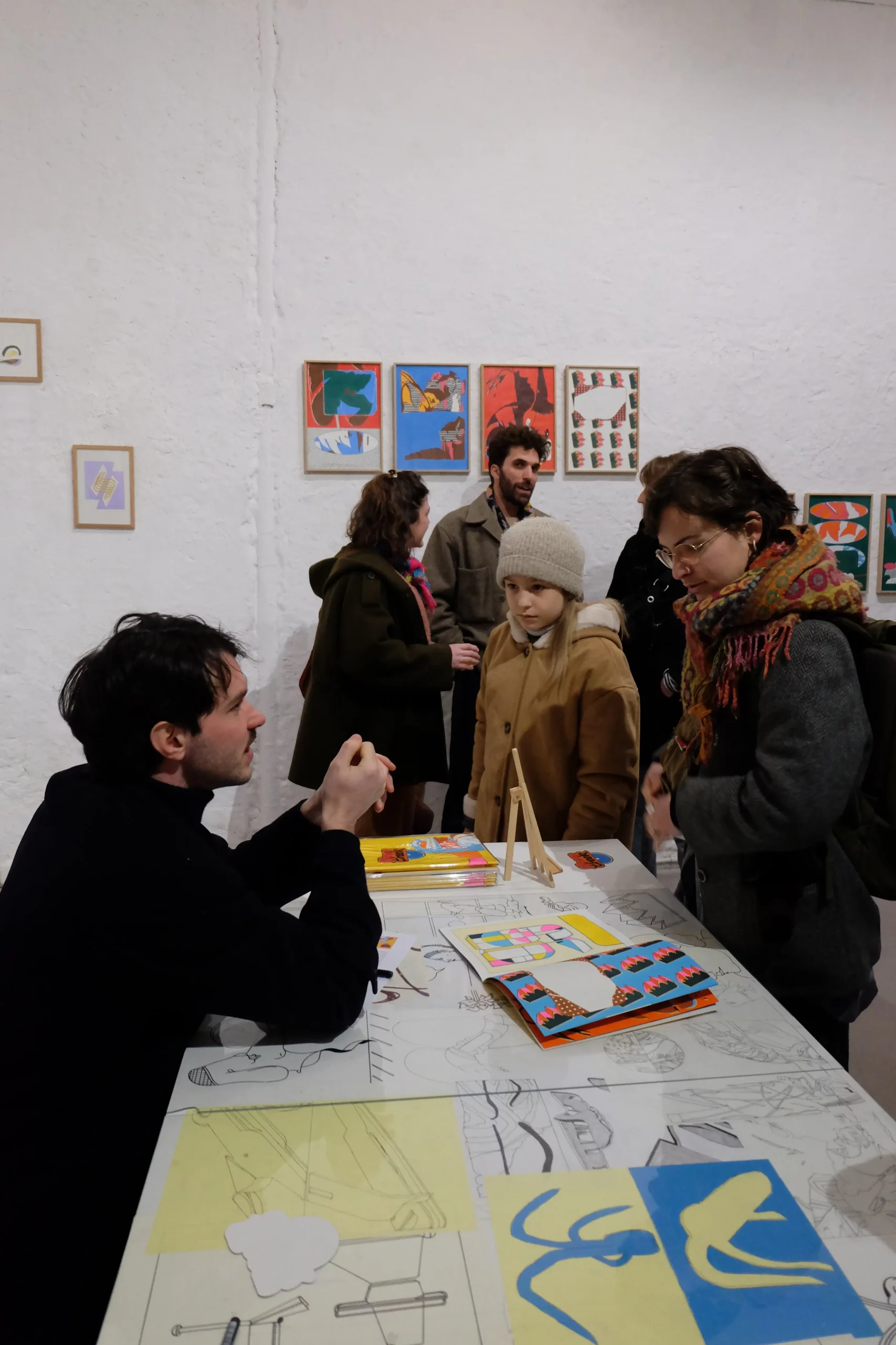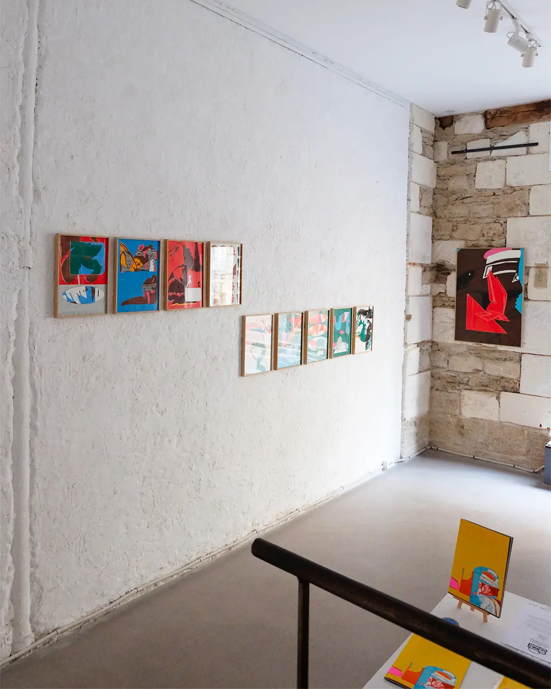 Compositions à 2 ou 4 mains, accumulation et évidages successifs de calques numériques; de cet échange graphique de plus d’un an, résulte un monde silencieux et pop. Les lignes claires et précises sont parasitées par l’explosion de masses de couleurs. Les dessins évoquent, donnent à penser et attirent mais n’imposent jamais une lecture unique.
