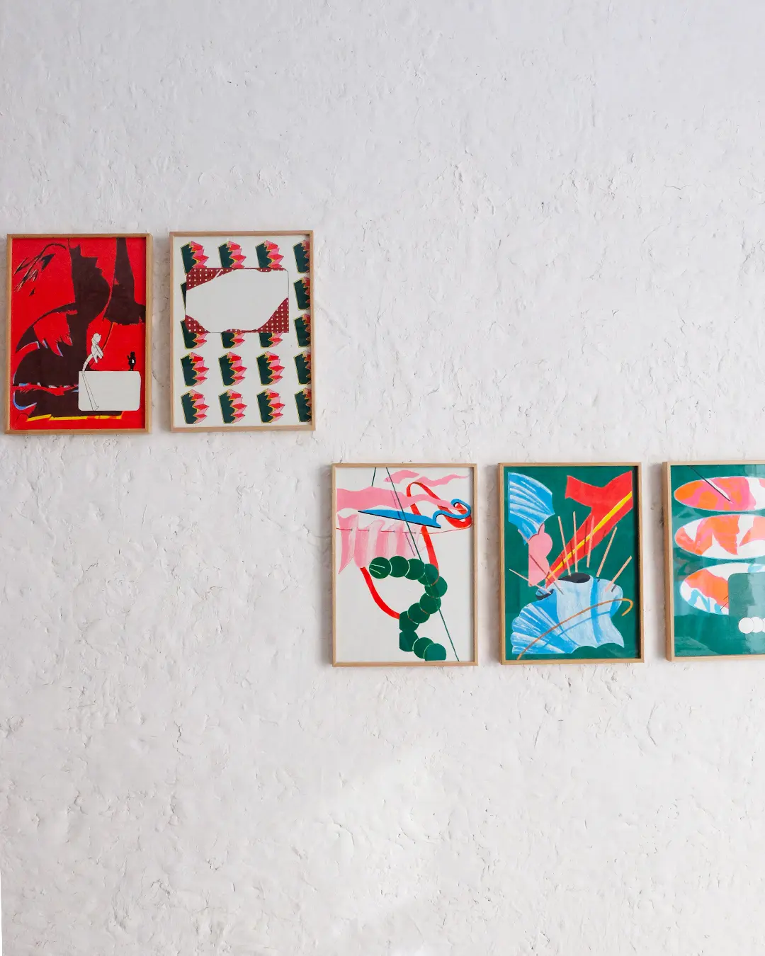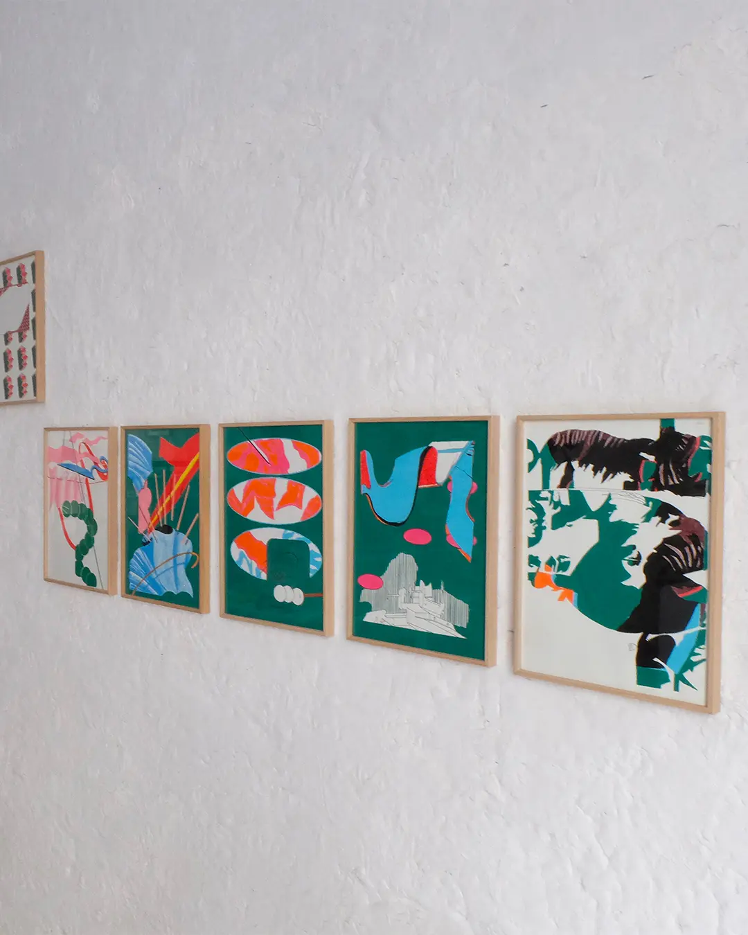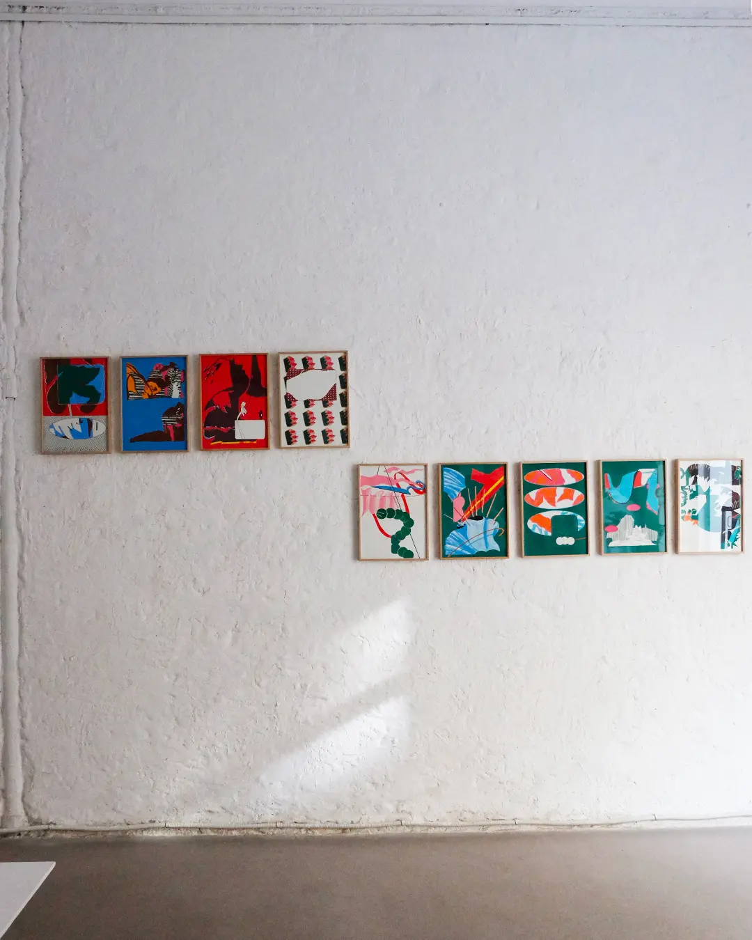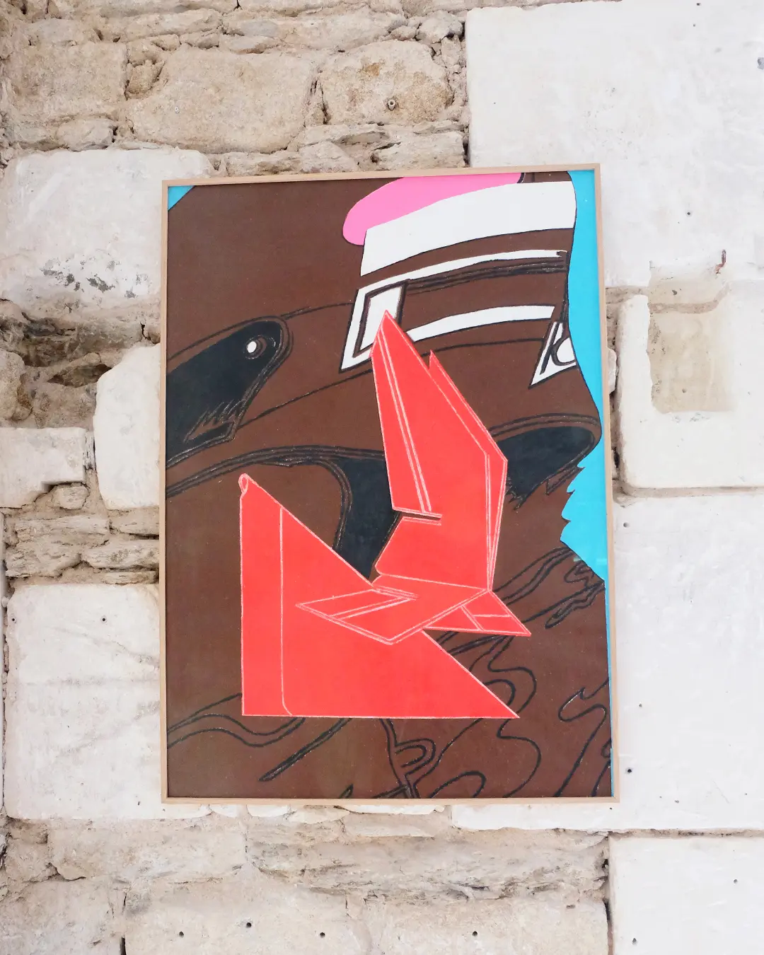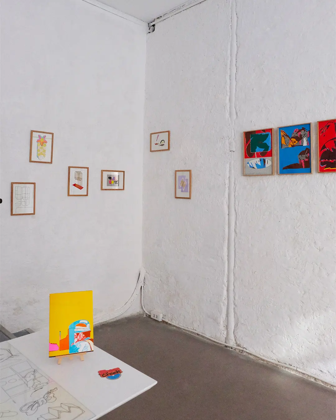 Compositions à 2 ou 4 mains, accumulation et évidages successifs de calques numériques; de cet échange graphique de plus d’un an, résulte un monde silencieux et pop. Les lignes claires et précises sont parasitées par l’explosion de masses de couleurs. Les dessins évoquent, donnent à penser et attirent mais n’imposent jamais une lecture unique.