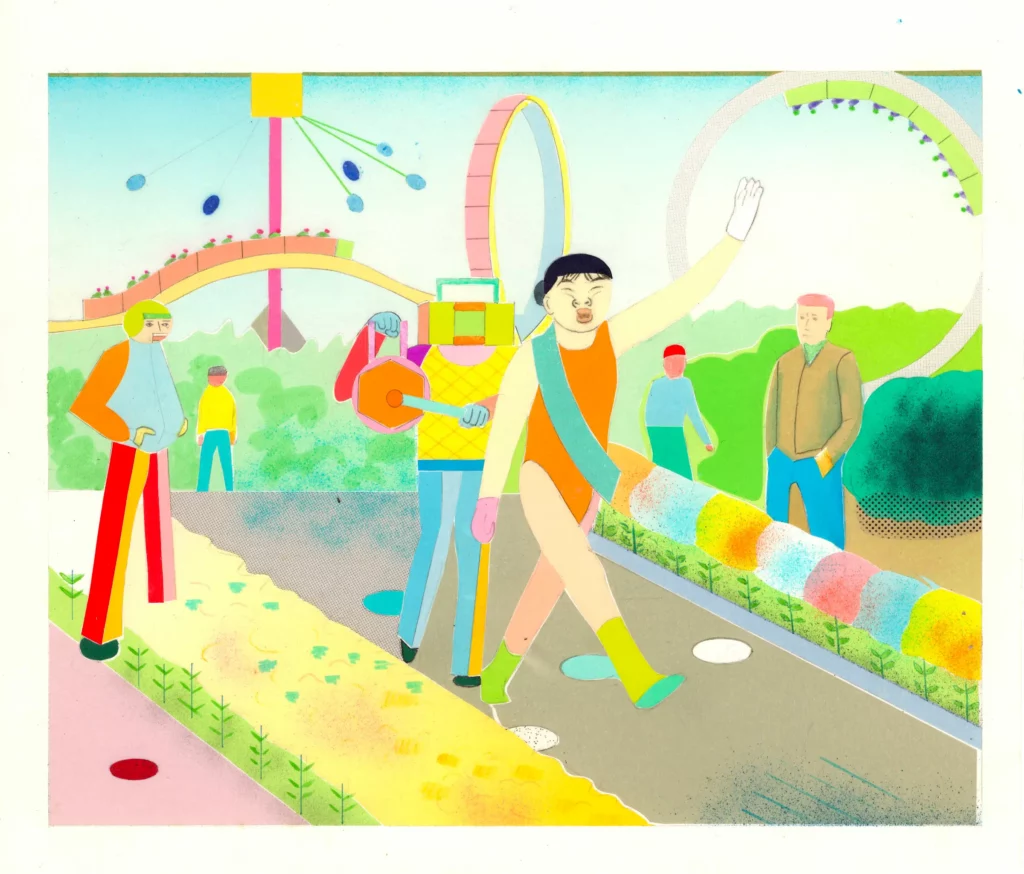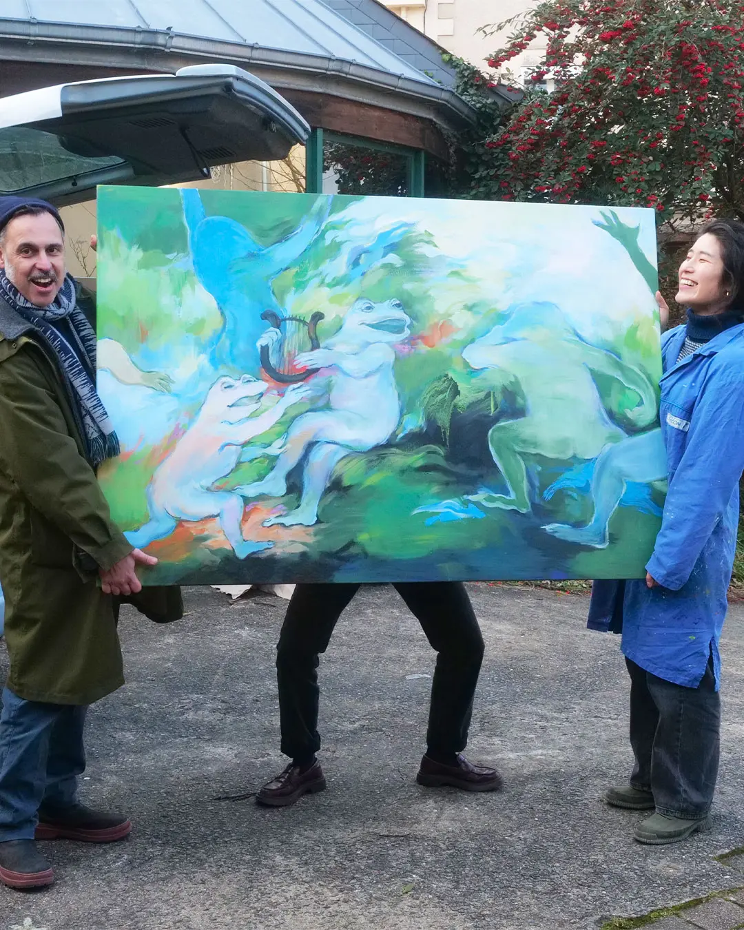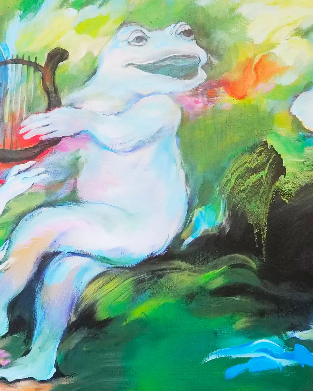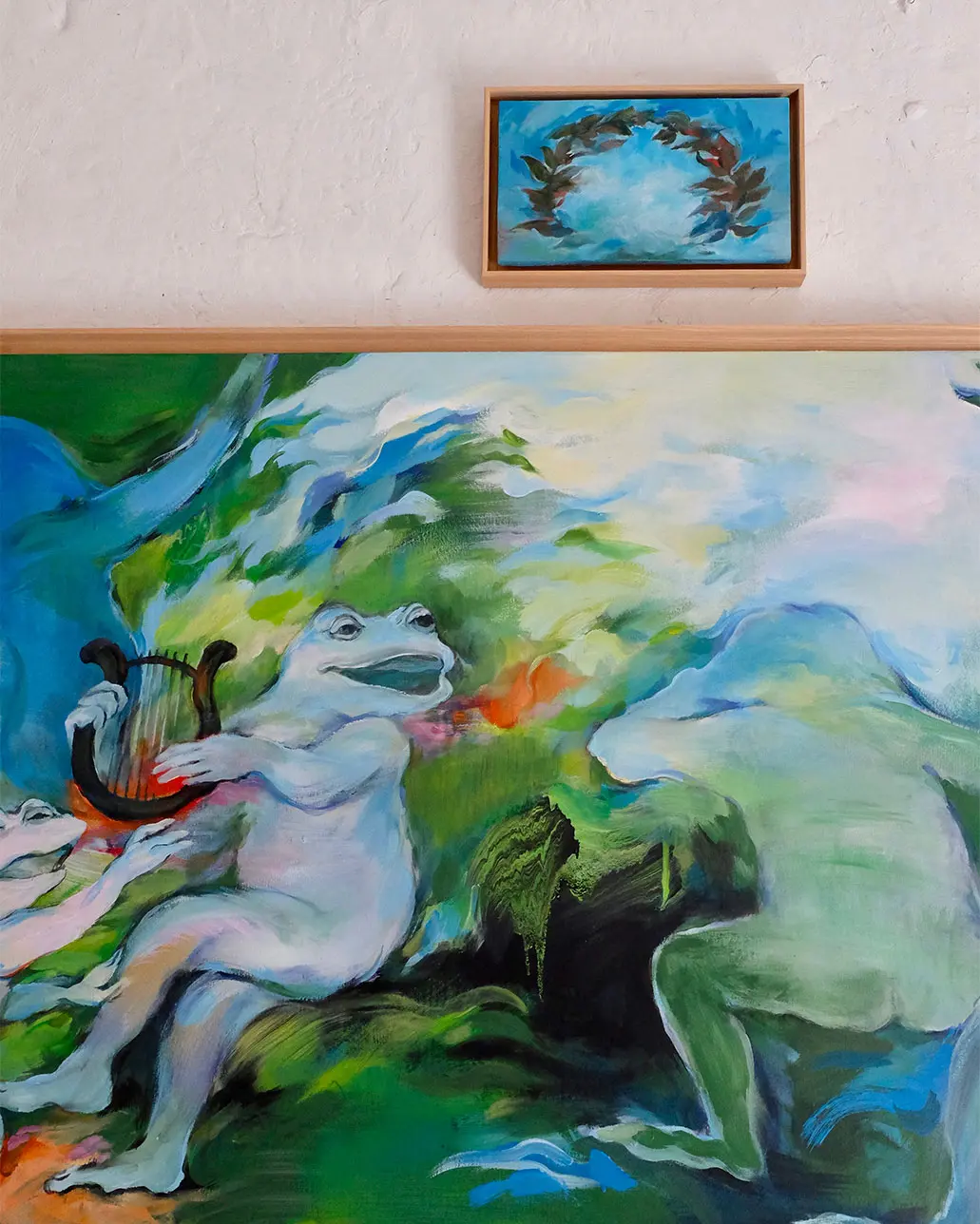 Elle s’empare de l’image d’Apollon et de ses pouvoirs divinatoires, et nous révèle un futur où les arts triomphent dans Fête (Apollon et les muses), à travers l’image de la grenouille, animal particulièrement vénéré au Japon, qui apporte chance, protection et prospérité.