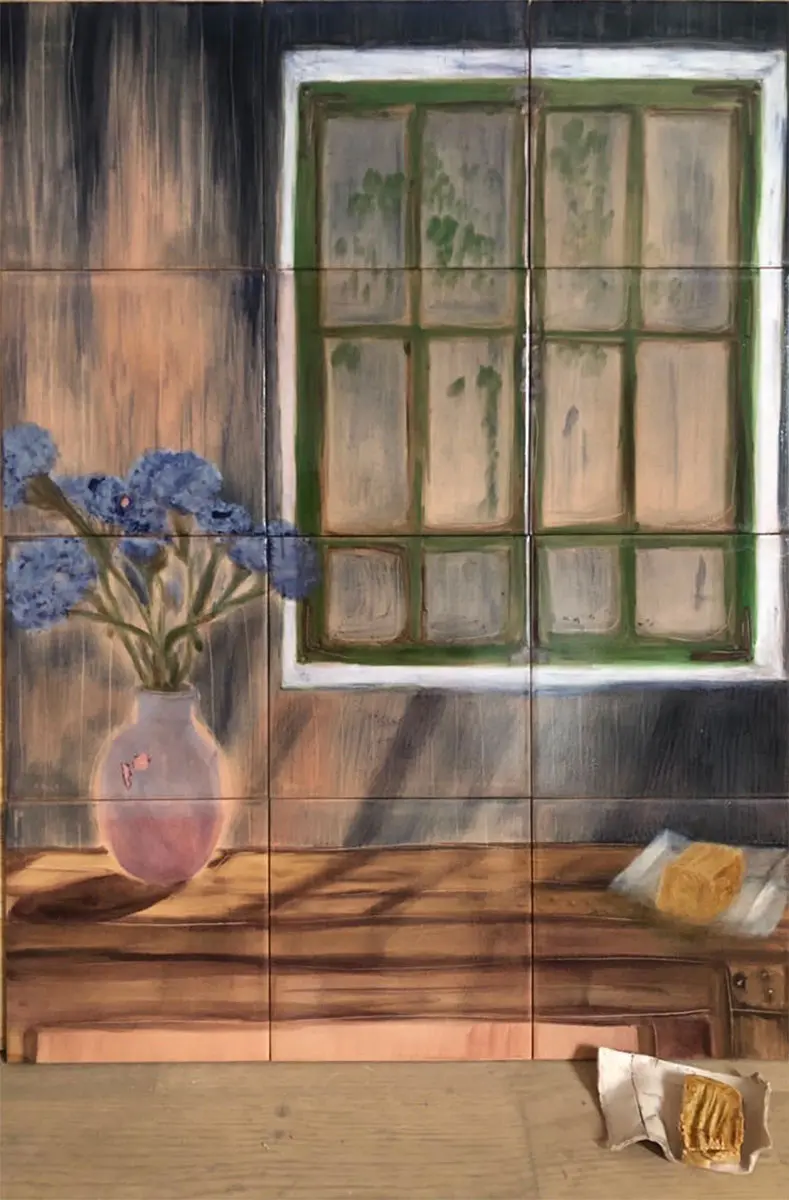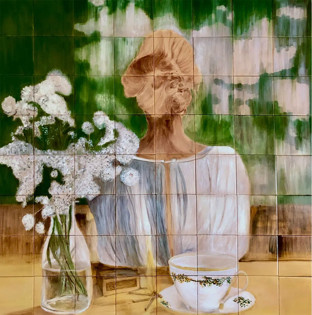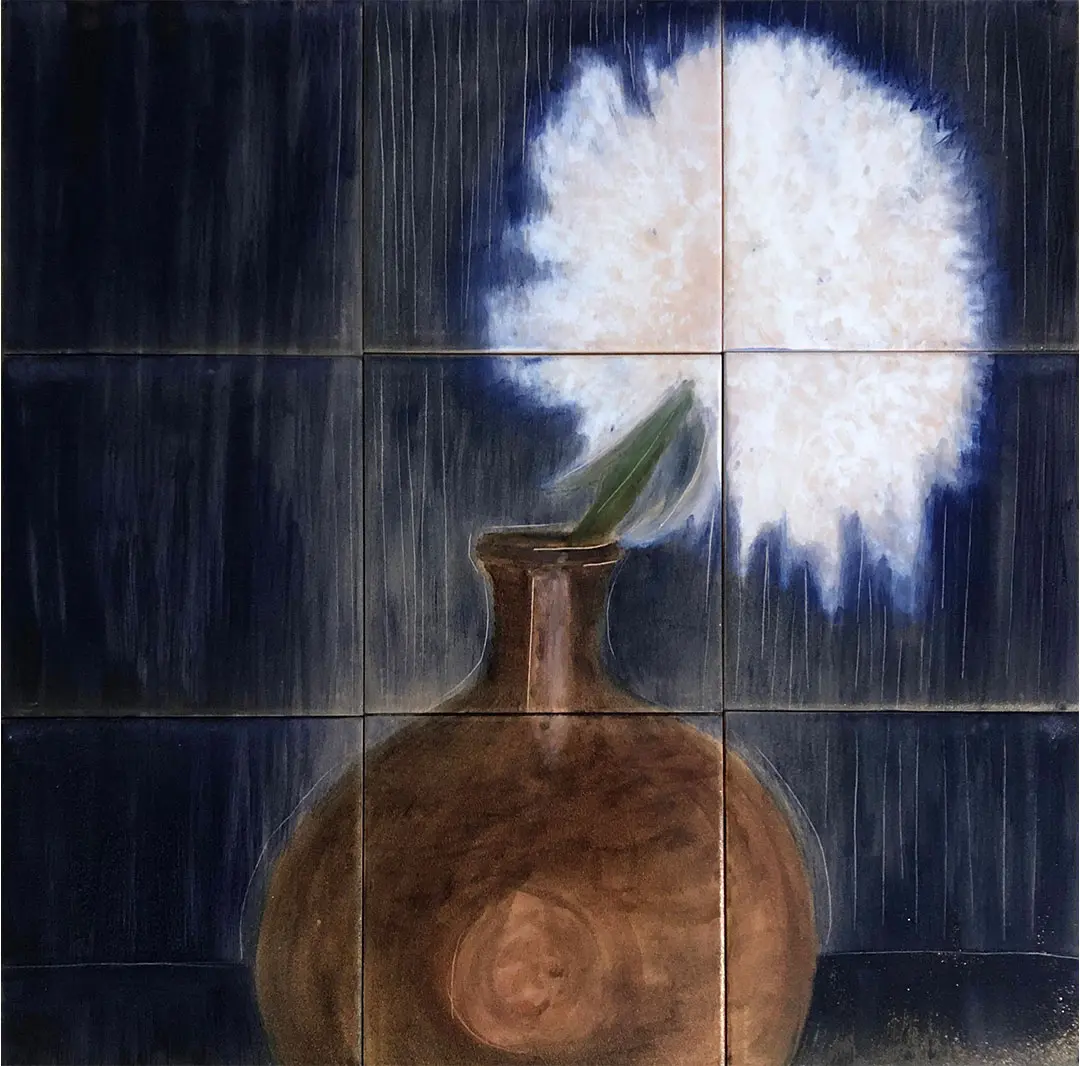 GLa recherche alchimique et le dialogue entre la matière et la lumière sont au cœur de son travail. Les carreaux de faïence qu’elle peint sont des témoins de cette transformation, chaque pièce étant le fruit d’un dialogue avec le feu, qui opère une « révélation » par la cuisson, dévoilant des nuances, des ombres et des éclats de couleurs et lumière.