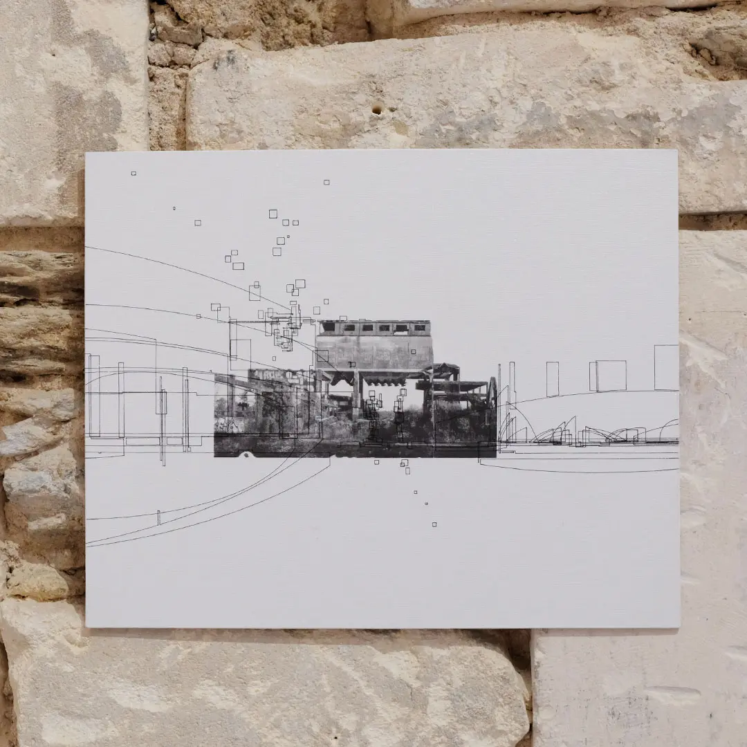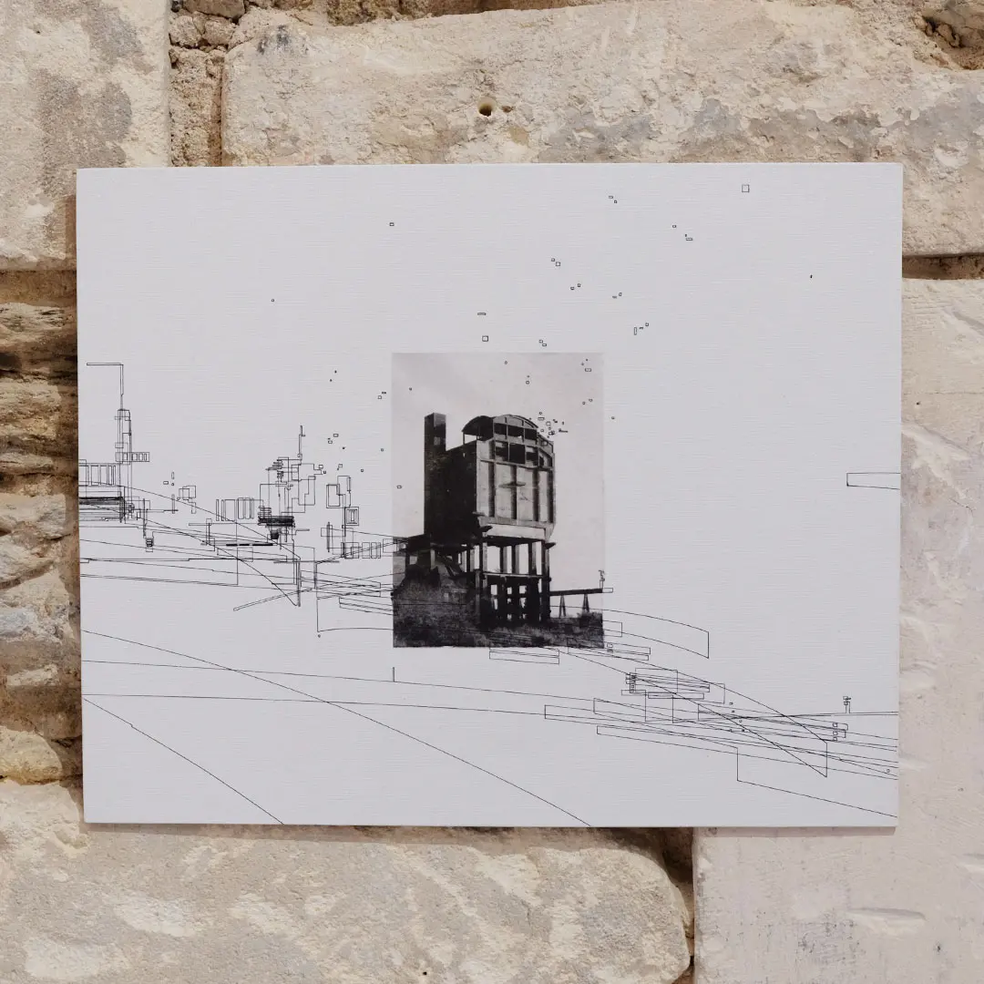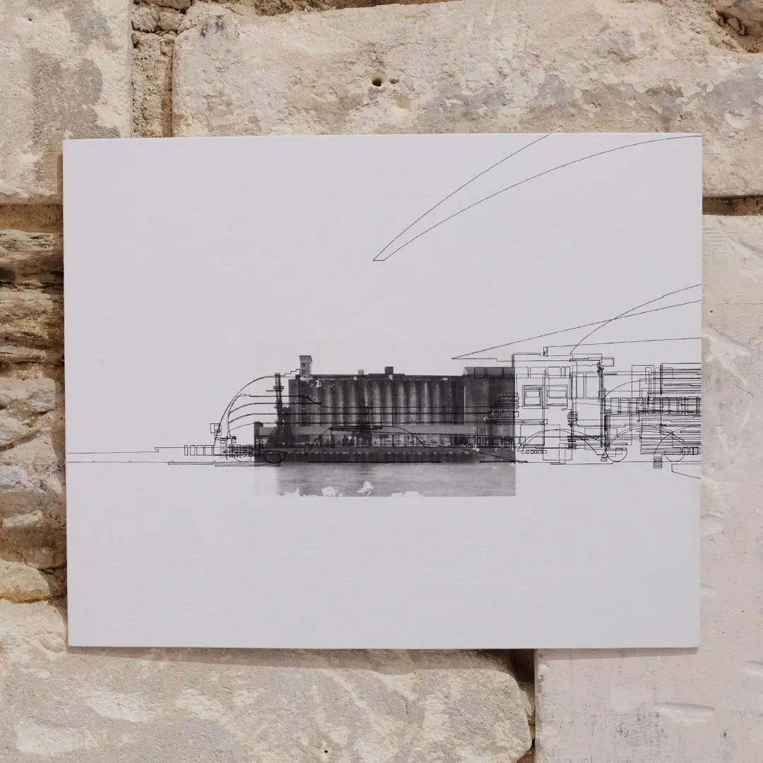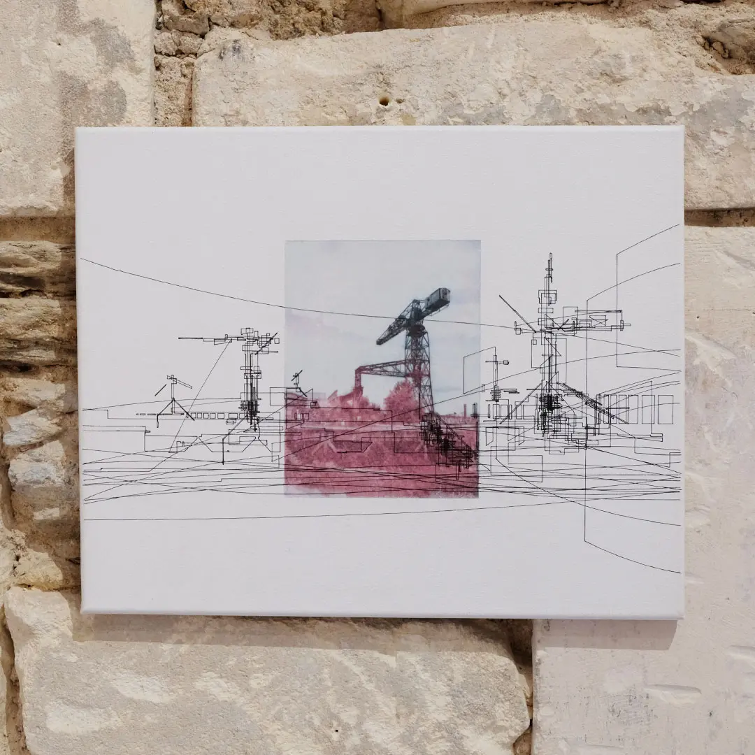 Les dessins exposés, réalisés en technique mixte, convoquent le patrimoine architectural industriel de notre région, et dans ses nouvelles linogravures, l’artiste nous propose une autre lecture de l’urbanisme de la ville de Nantes, ludique et utopique.