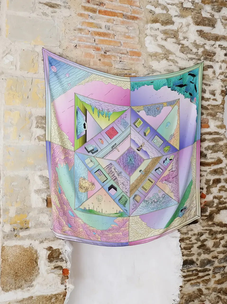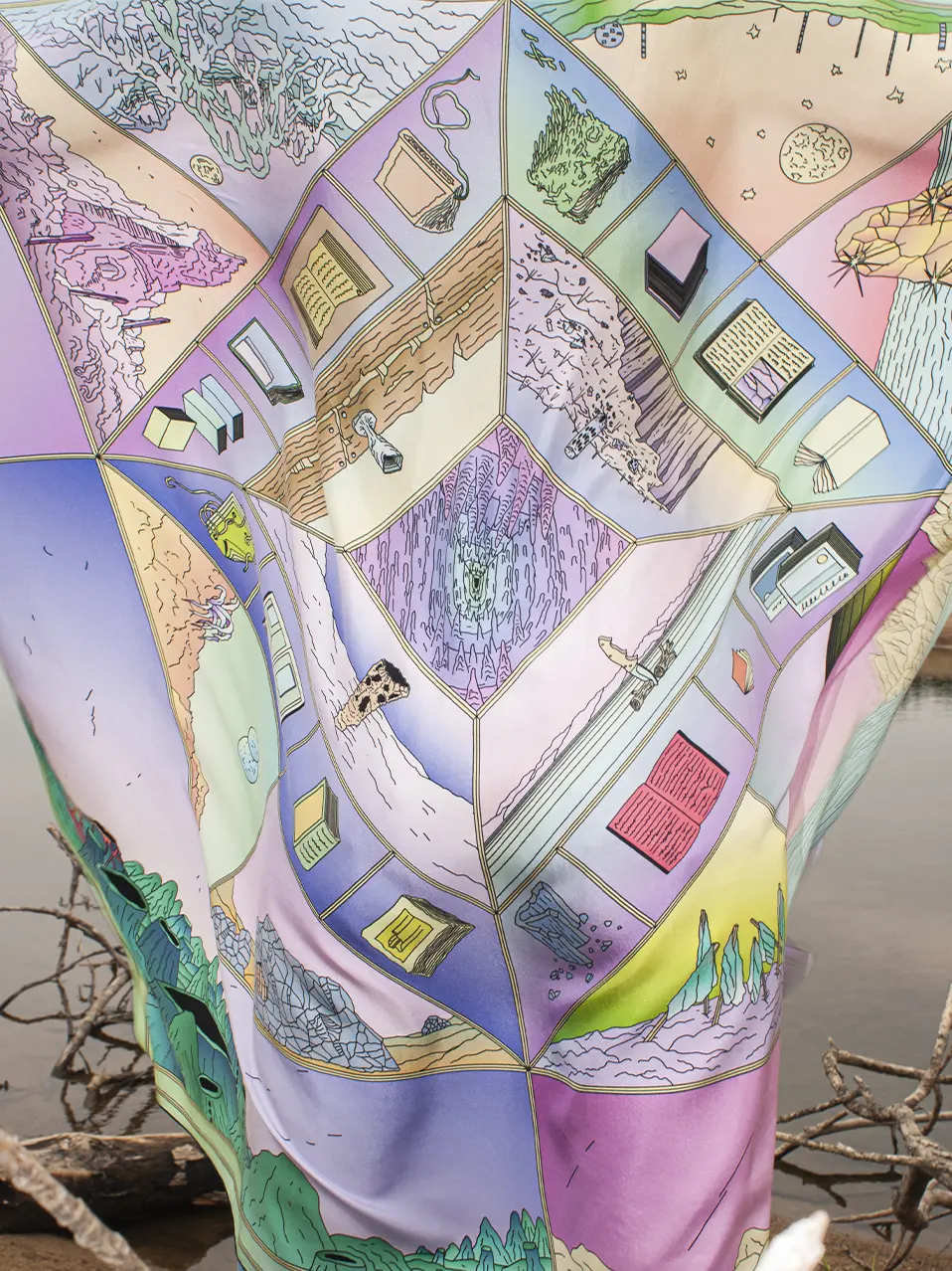 Cette pièce de soie à été créée à partir d’une œuvre originale de l’artiste Sammy STEIN, dans le cadre de son exposition La Nuit des Livres-Pierres » en duo avec Séverine BASCOUERT du 6 mai au 25 juin 2022 à la galerie MIRA.